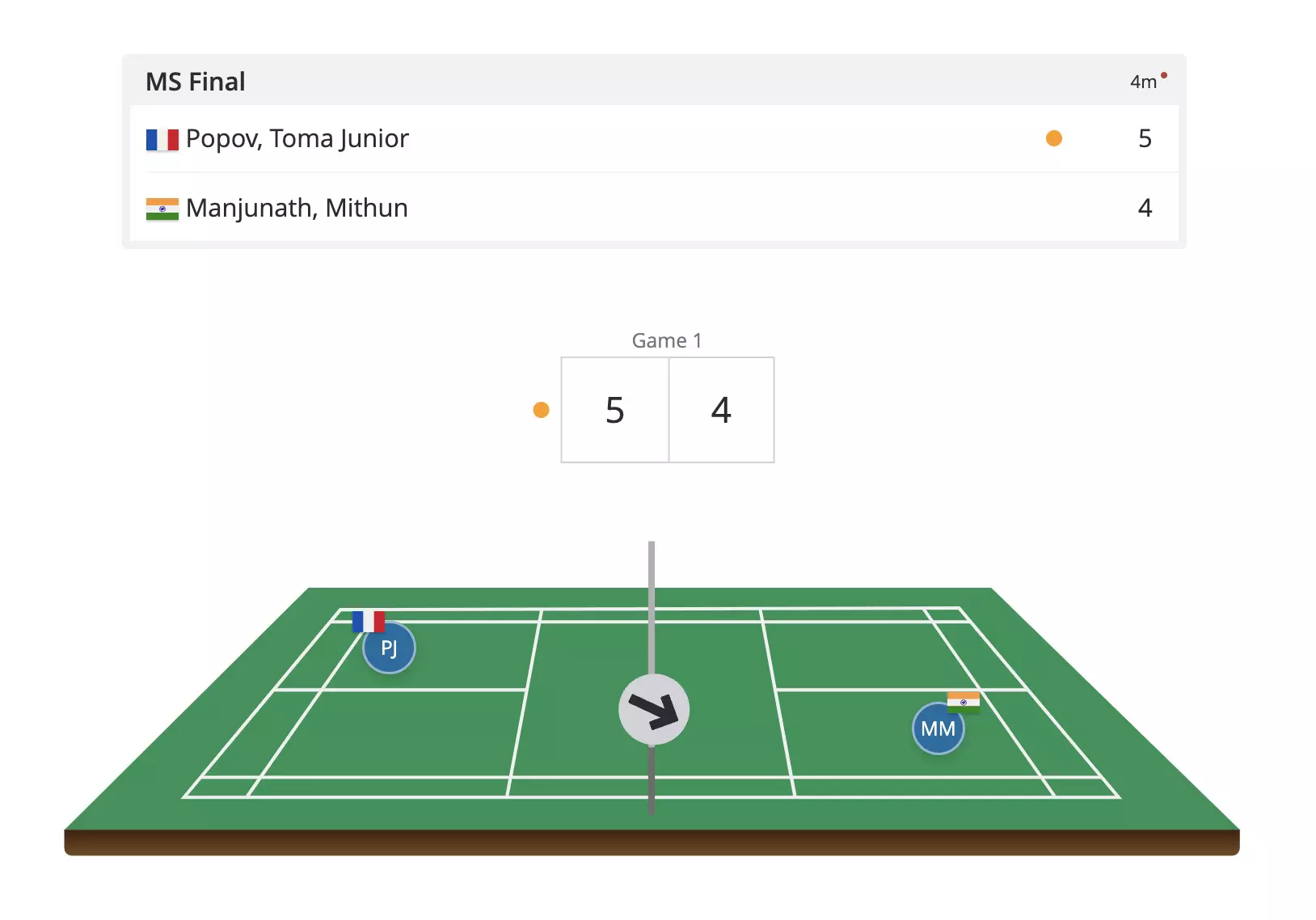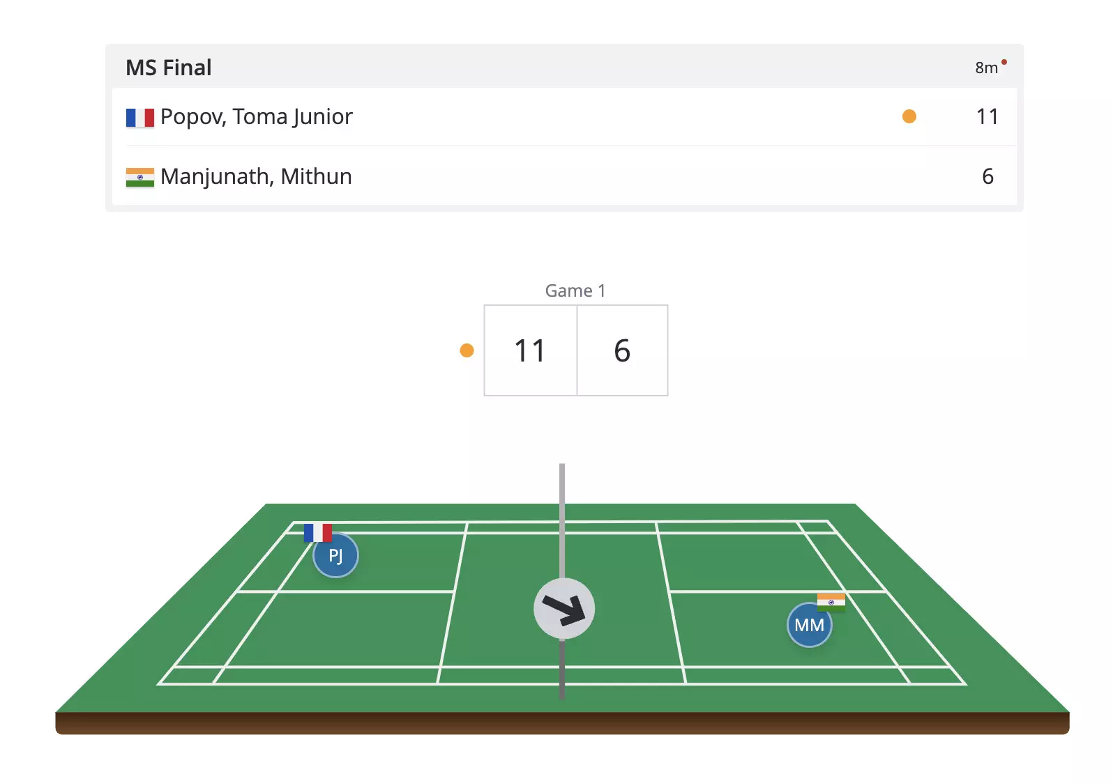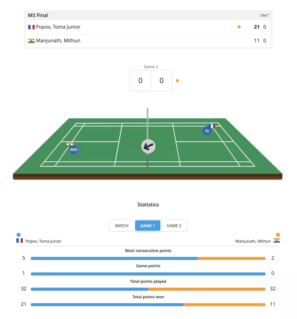 Popov takes a steady 9-6 lead as Mithun's returns find the net. Mithun needs to cut down on these errors and not give Popov room to attack!