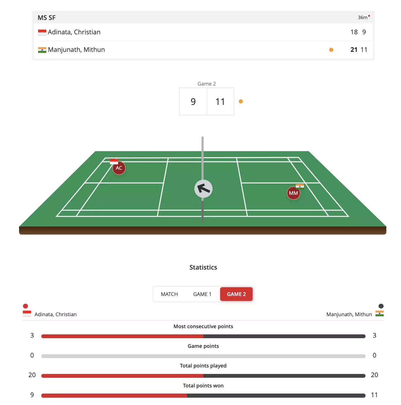 Mithun leads at 8-6 in the second game as the rallies get more intense.