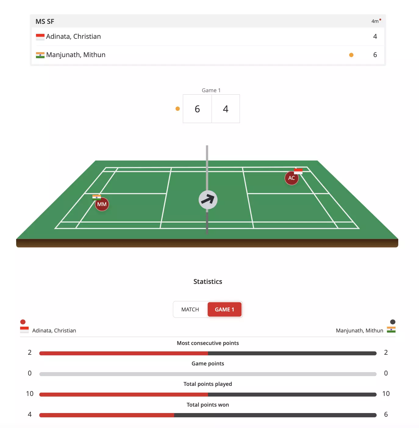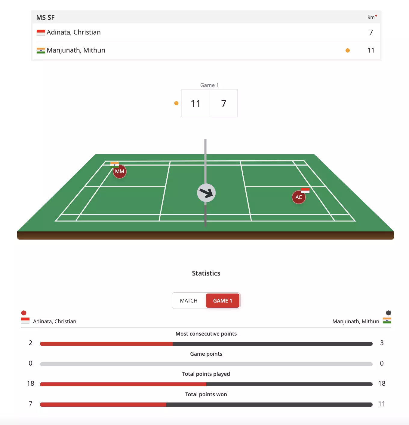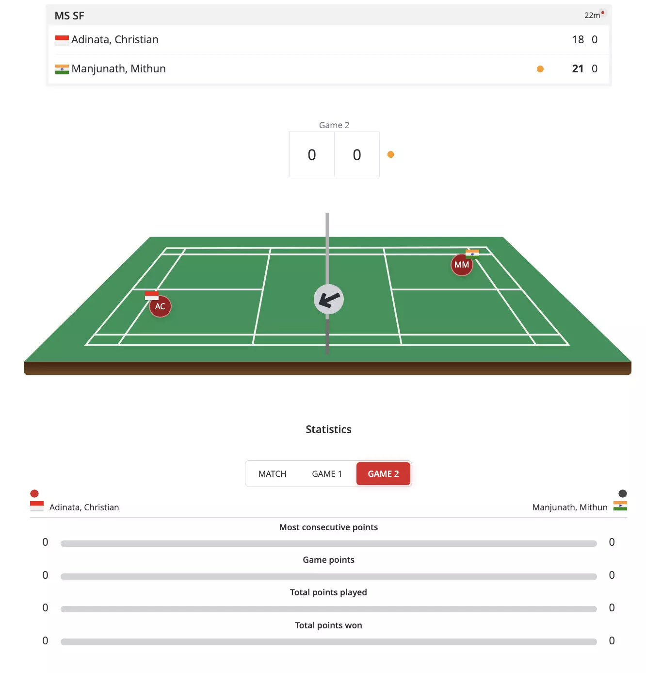 Mithun Manjunath smashes and takes the game point to pocket the first game 21-18! Let's gooo!