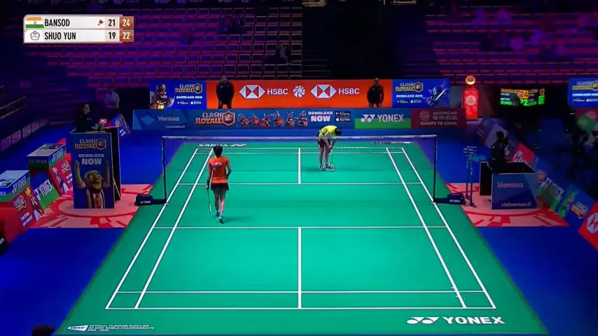 Shuo first hits one beyond the baseline and then hits one on the net to give Malvika 19-17 lead at a crucial juncture.