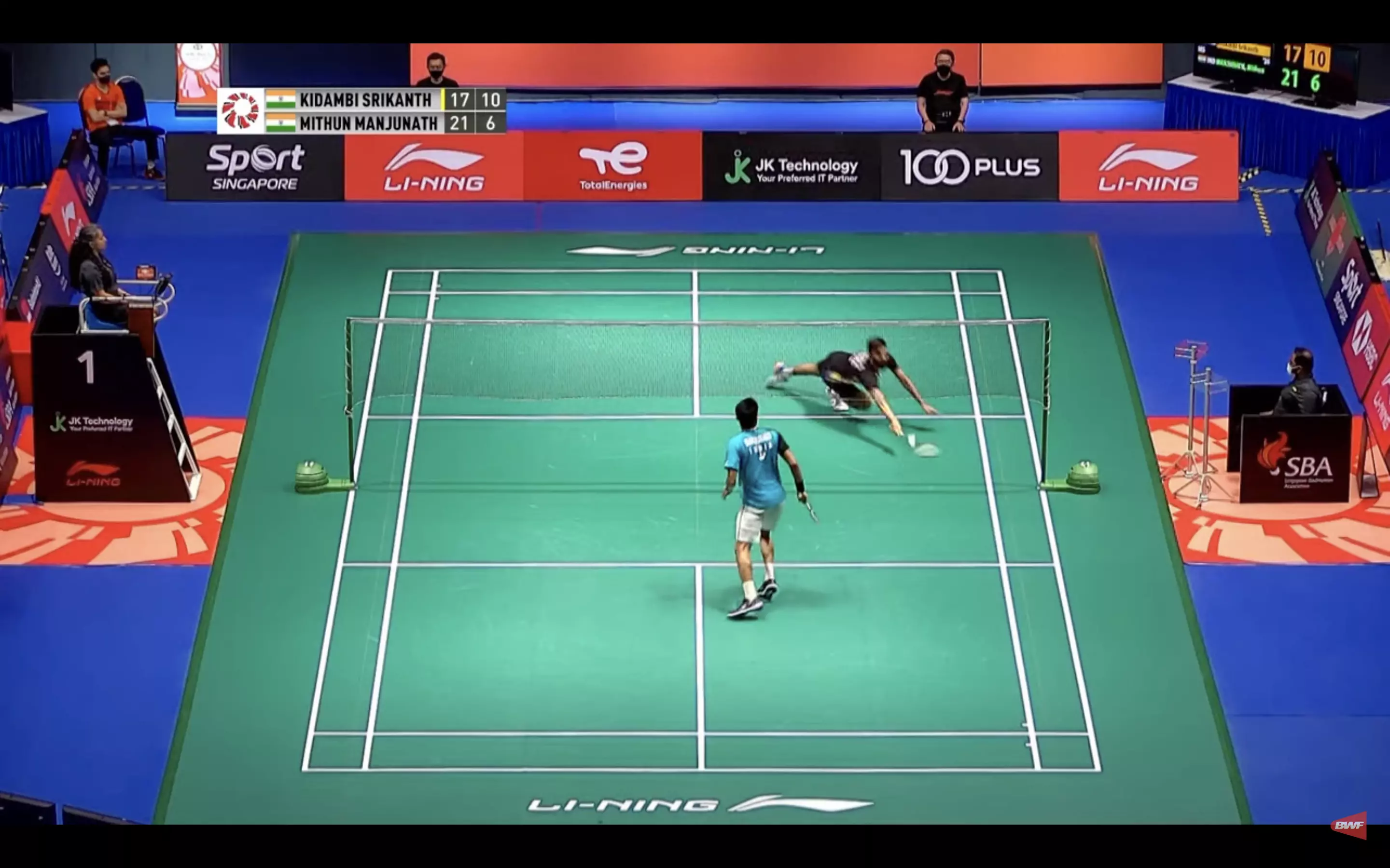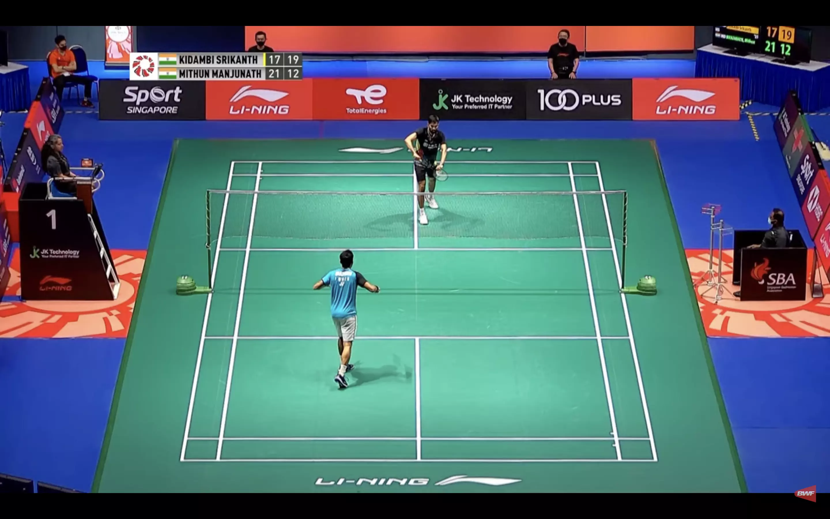 Srikanth makes errors at the net and his return also falls wide, gifting Mithun with game point opportunities.