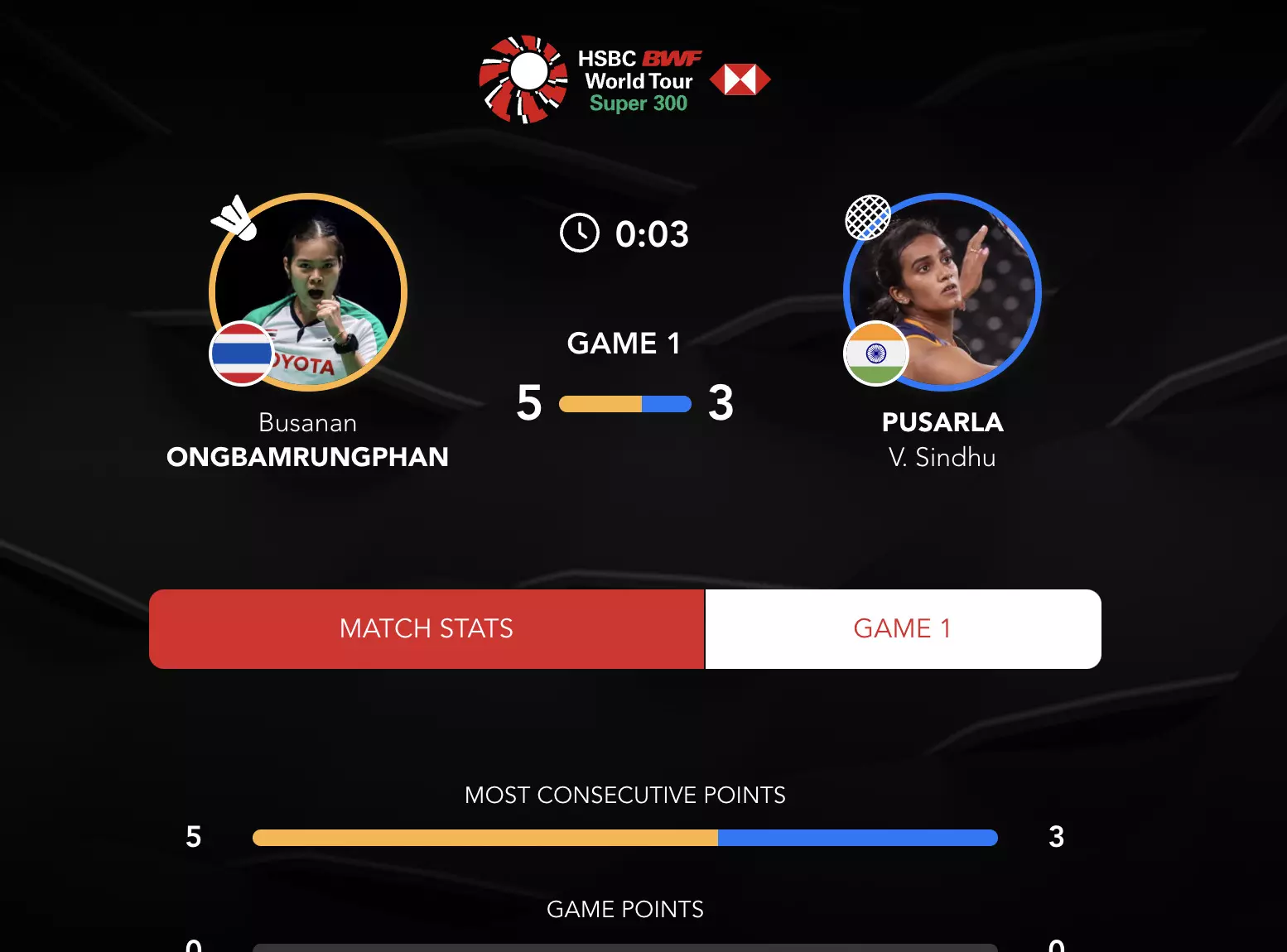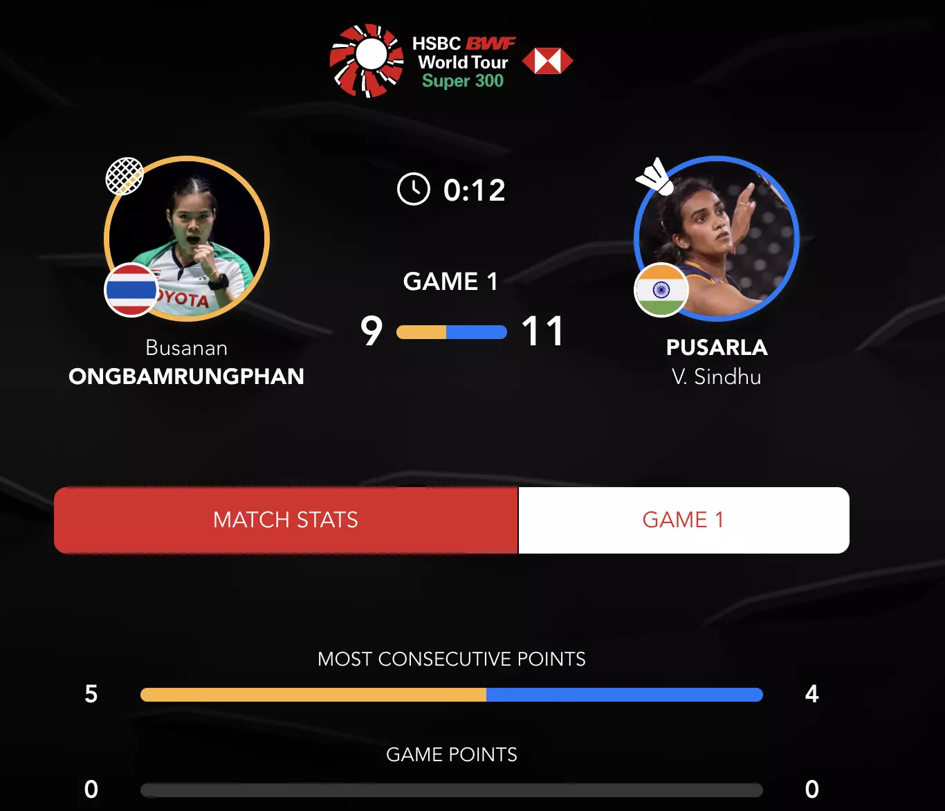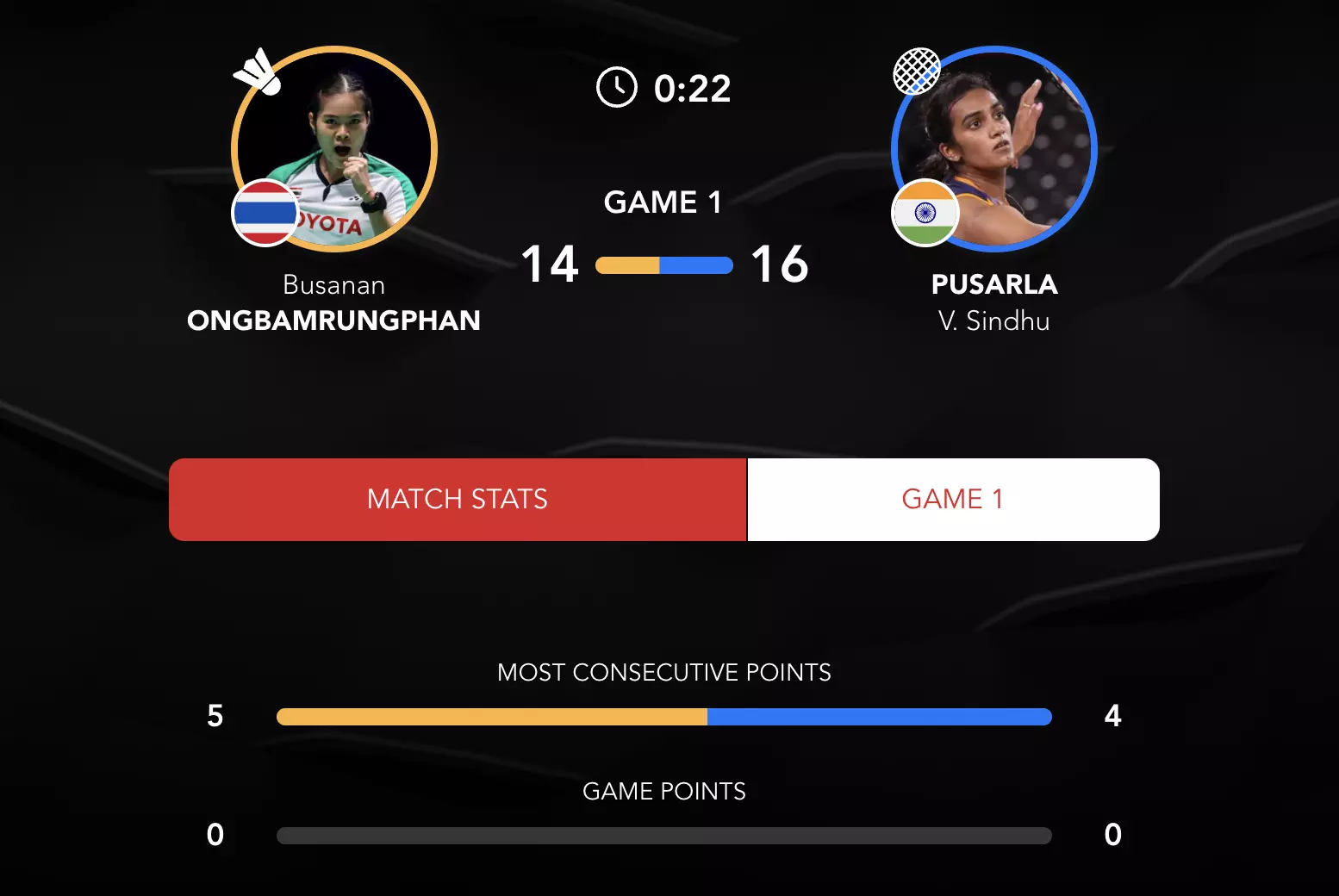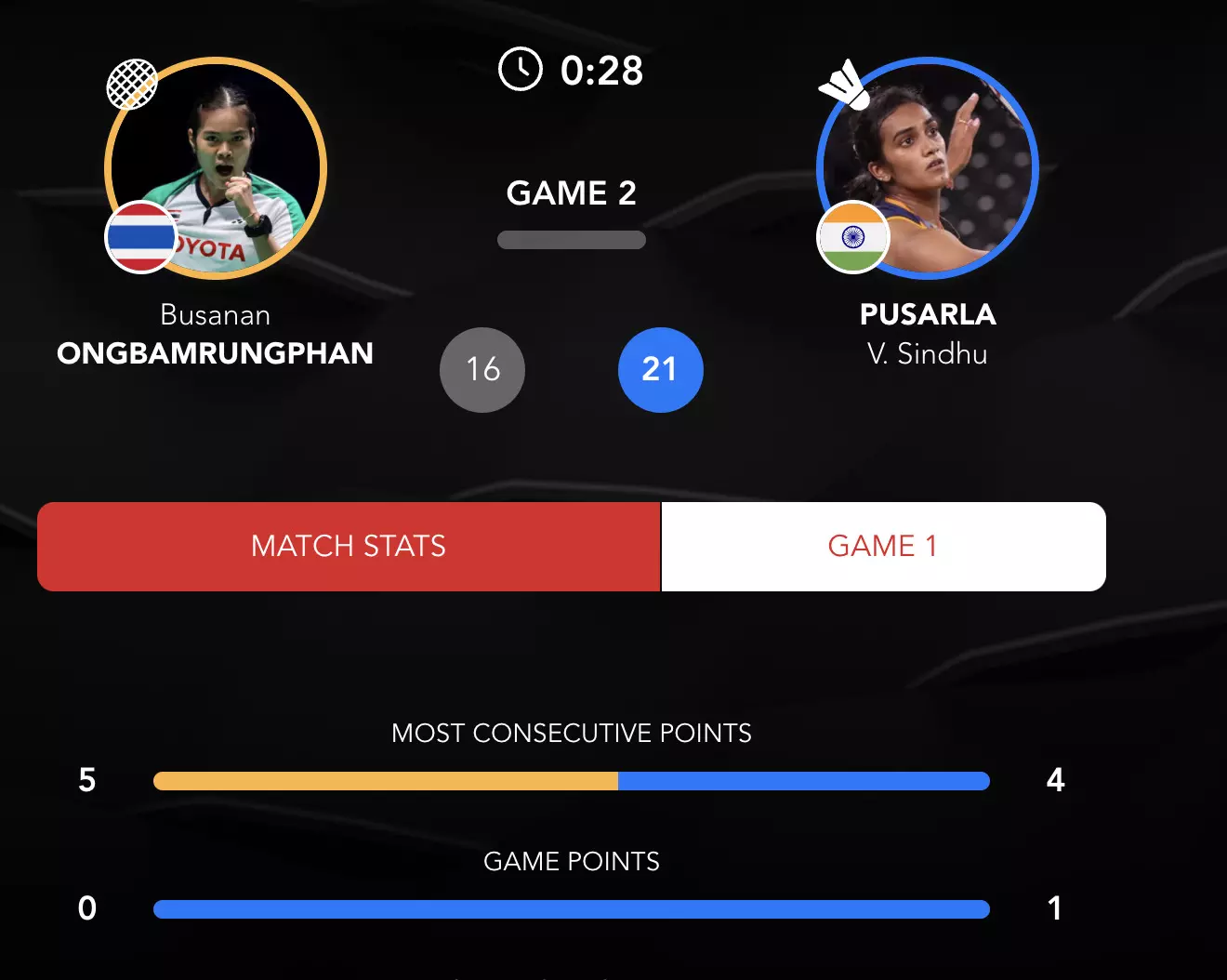Sindhu goes up 1-0 in the overall Game score with just 1 more game to win the tournament.