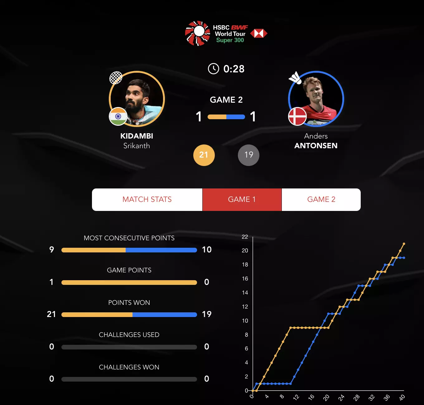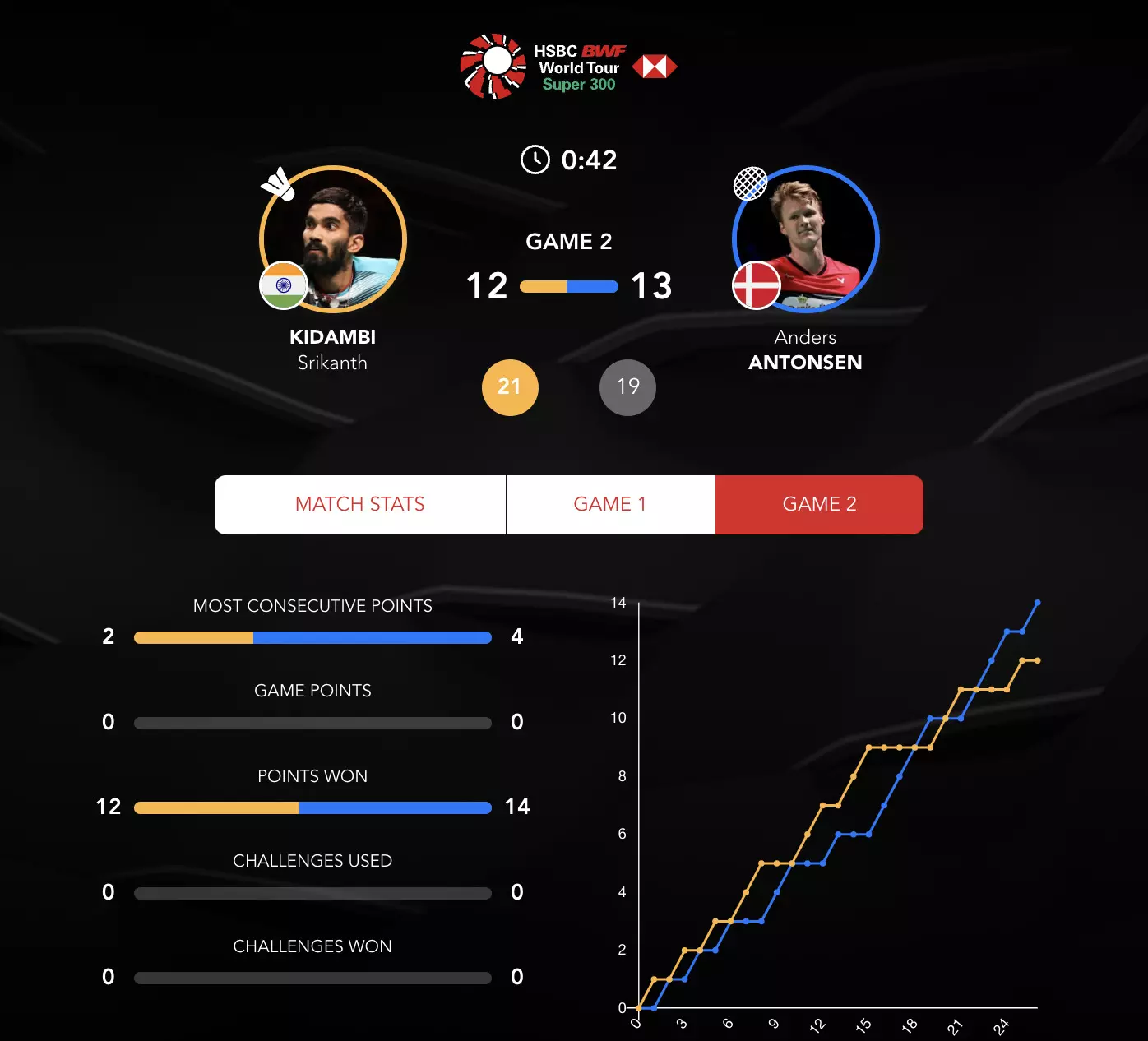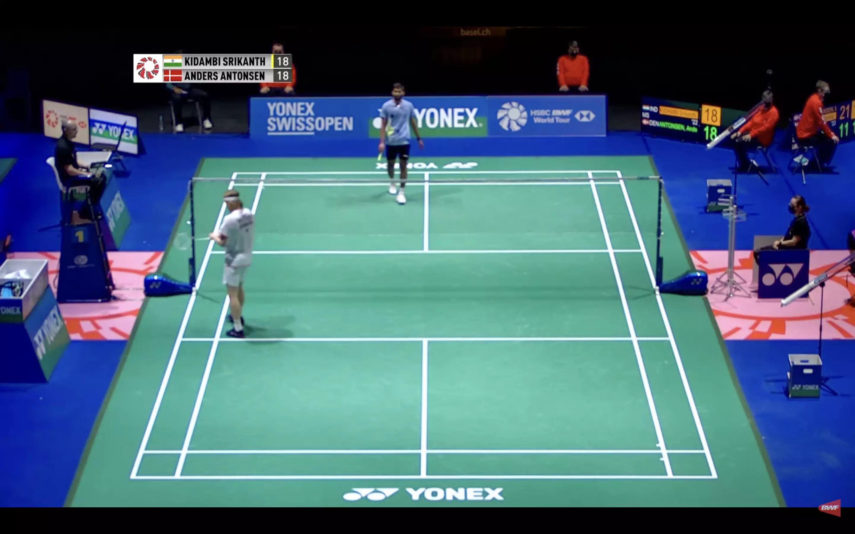 Srikanth and Antonsen stay at par - it is 18 ALL!
