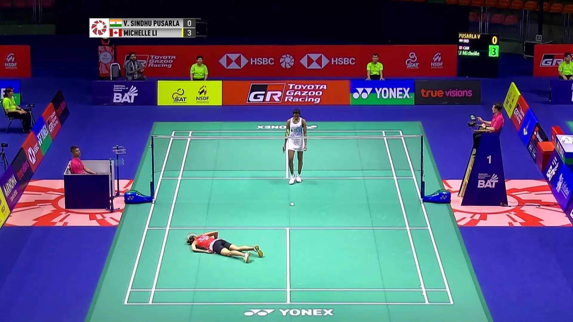PV Sindhu loses the first game after hitting one wide. She has looked very woobly, probably fatigue after a challenging week in Malaysia.