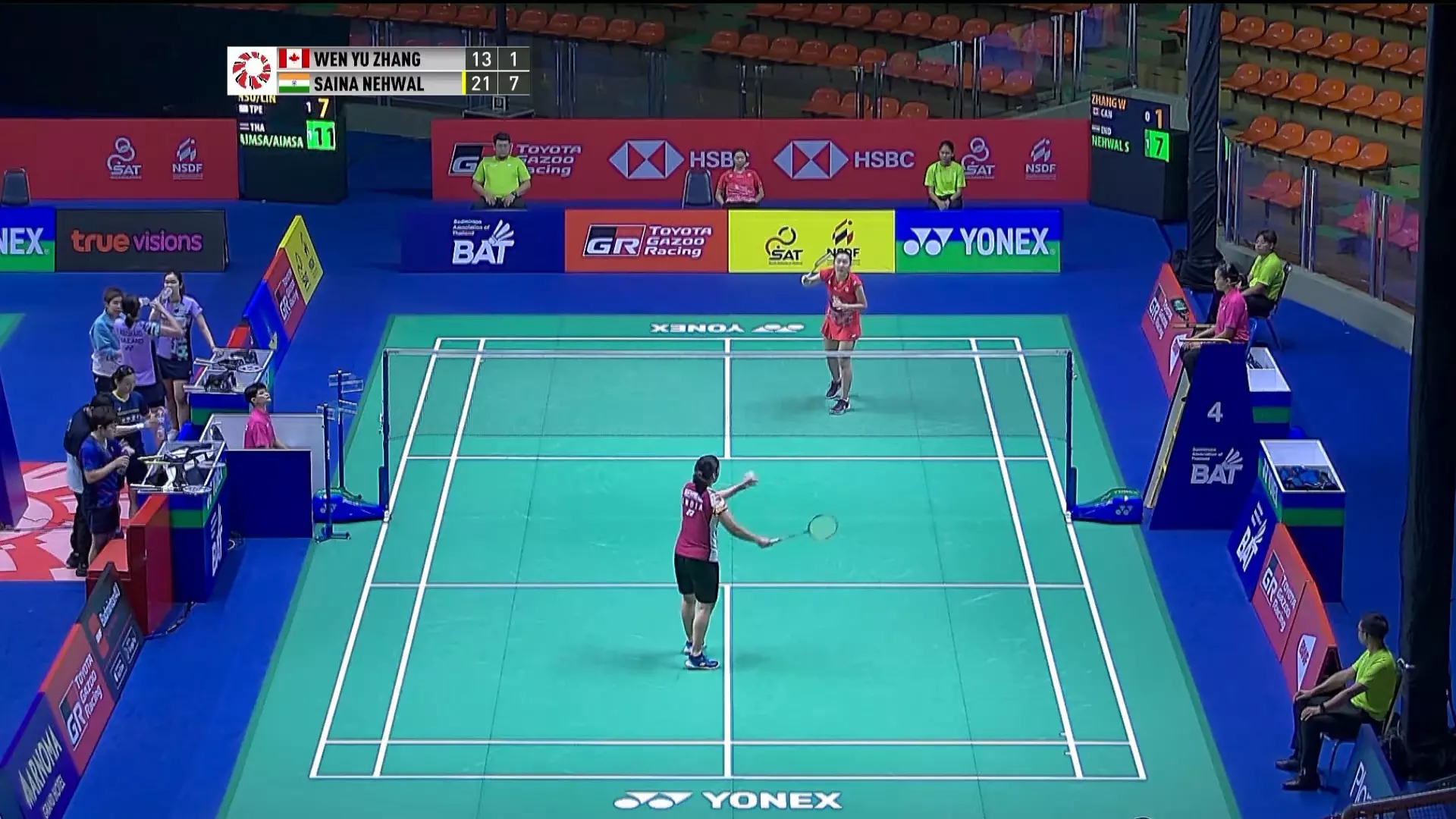 Playing against the qualifier Wen Yu Zhang, Saina Nehwal wins 21-13 in the first game.
