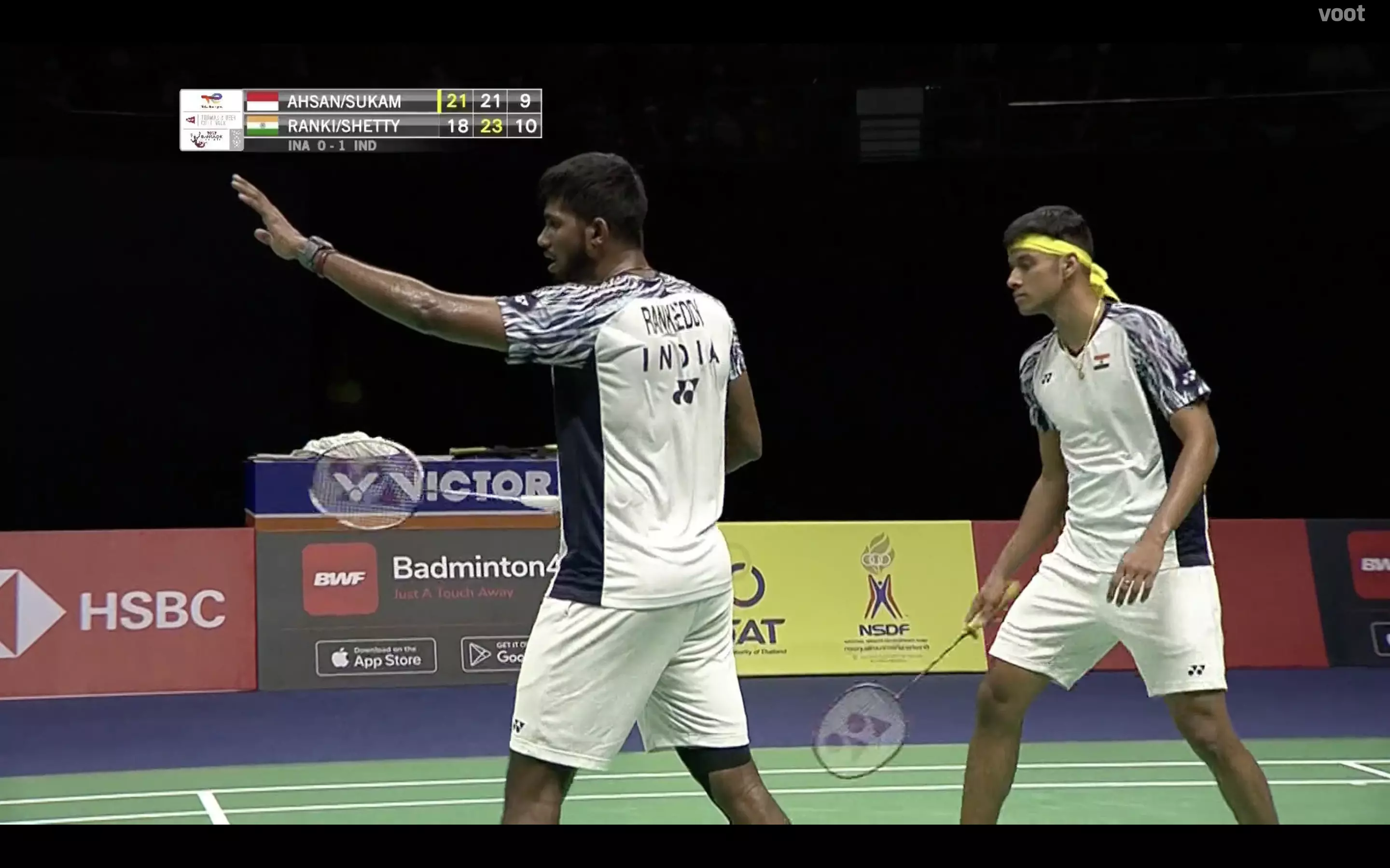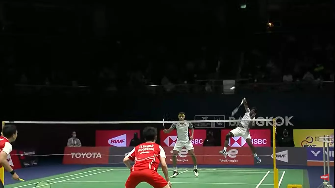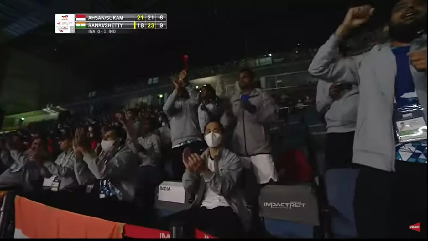 Satwik changes the momentum of the rally and delivers a finely-chopped smash on Ahsan's body. The Indians take the lead again by 9-6.