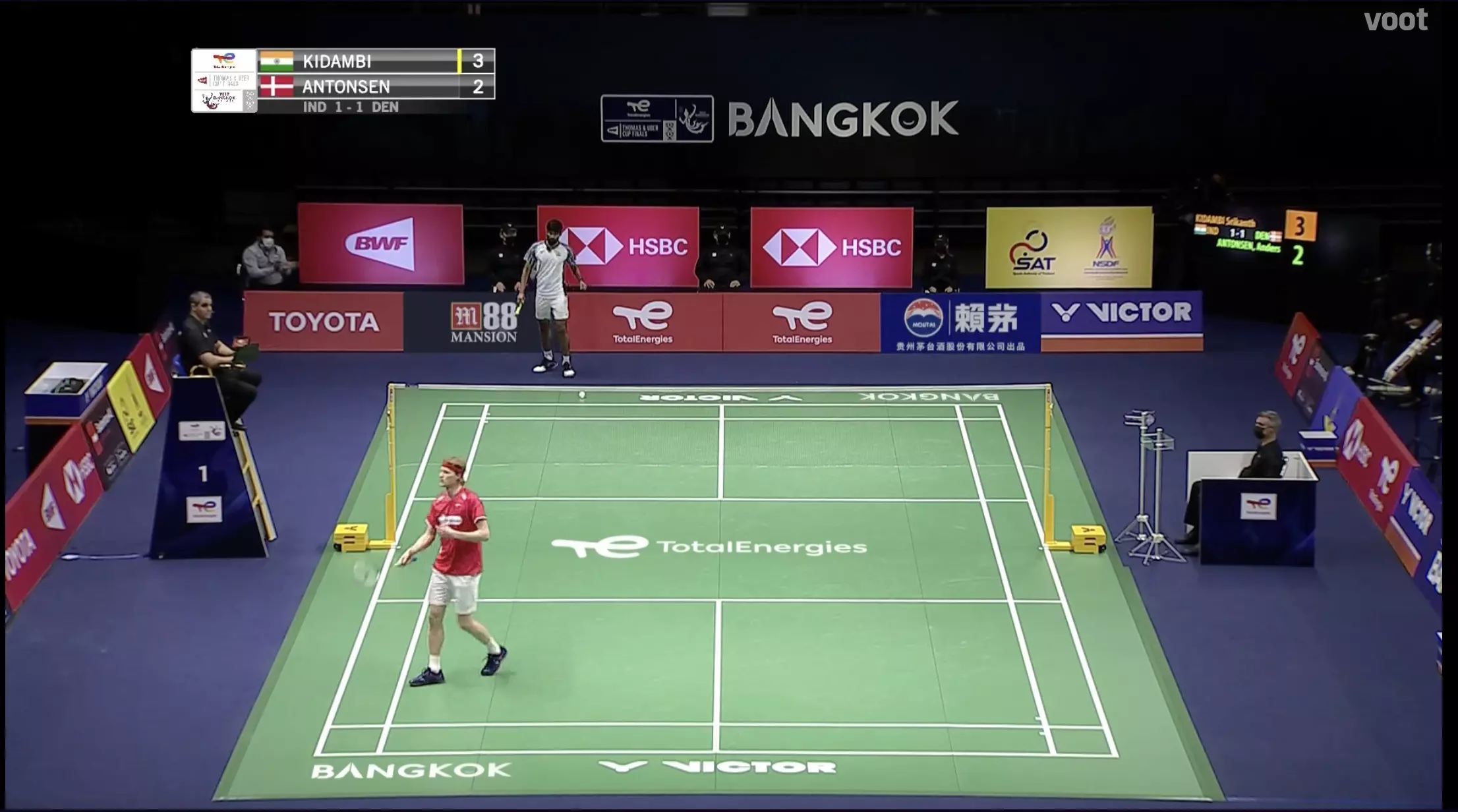 Antonsen hits it way wide of the court. Kidambi takes a lead with four successive points.