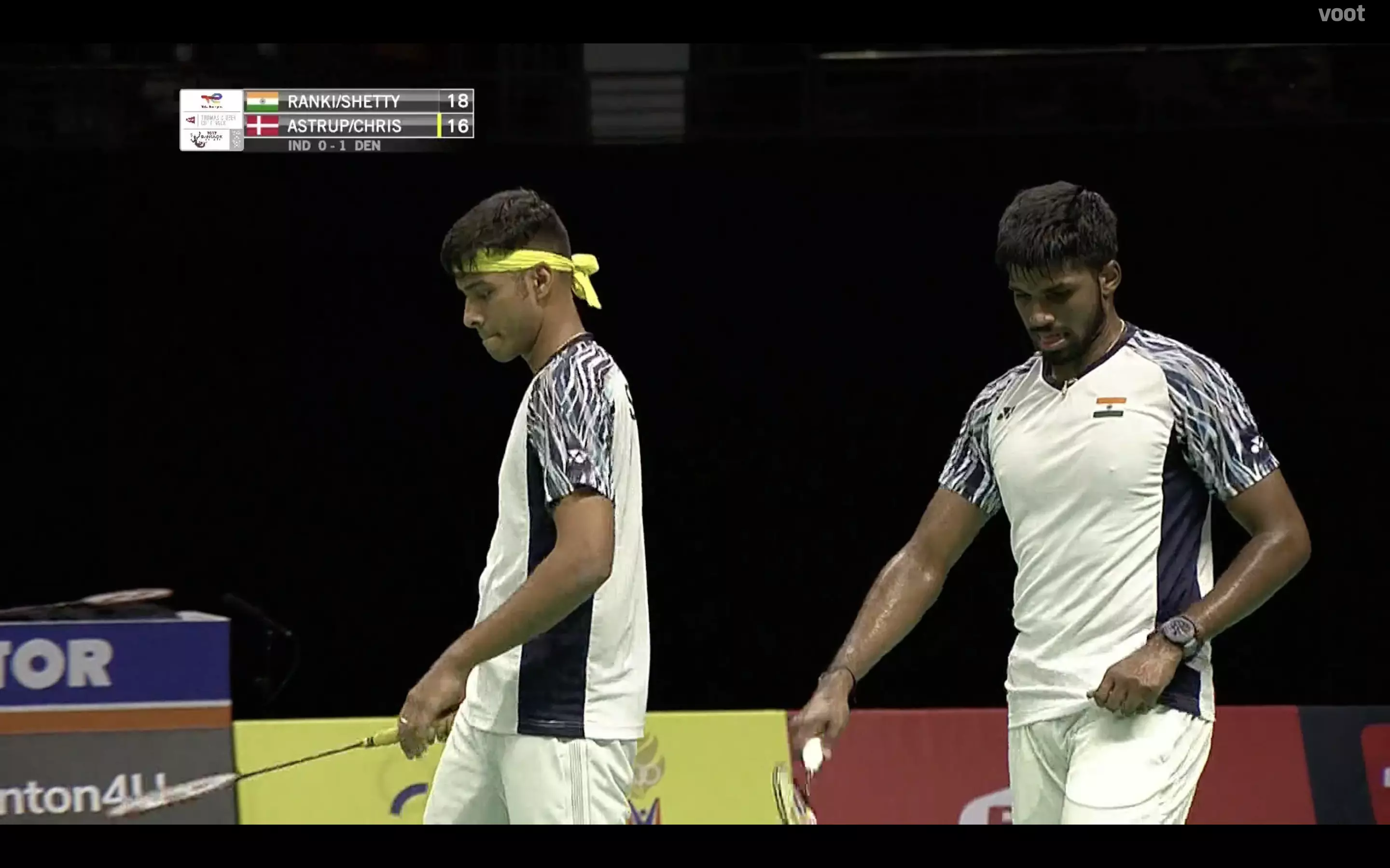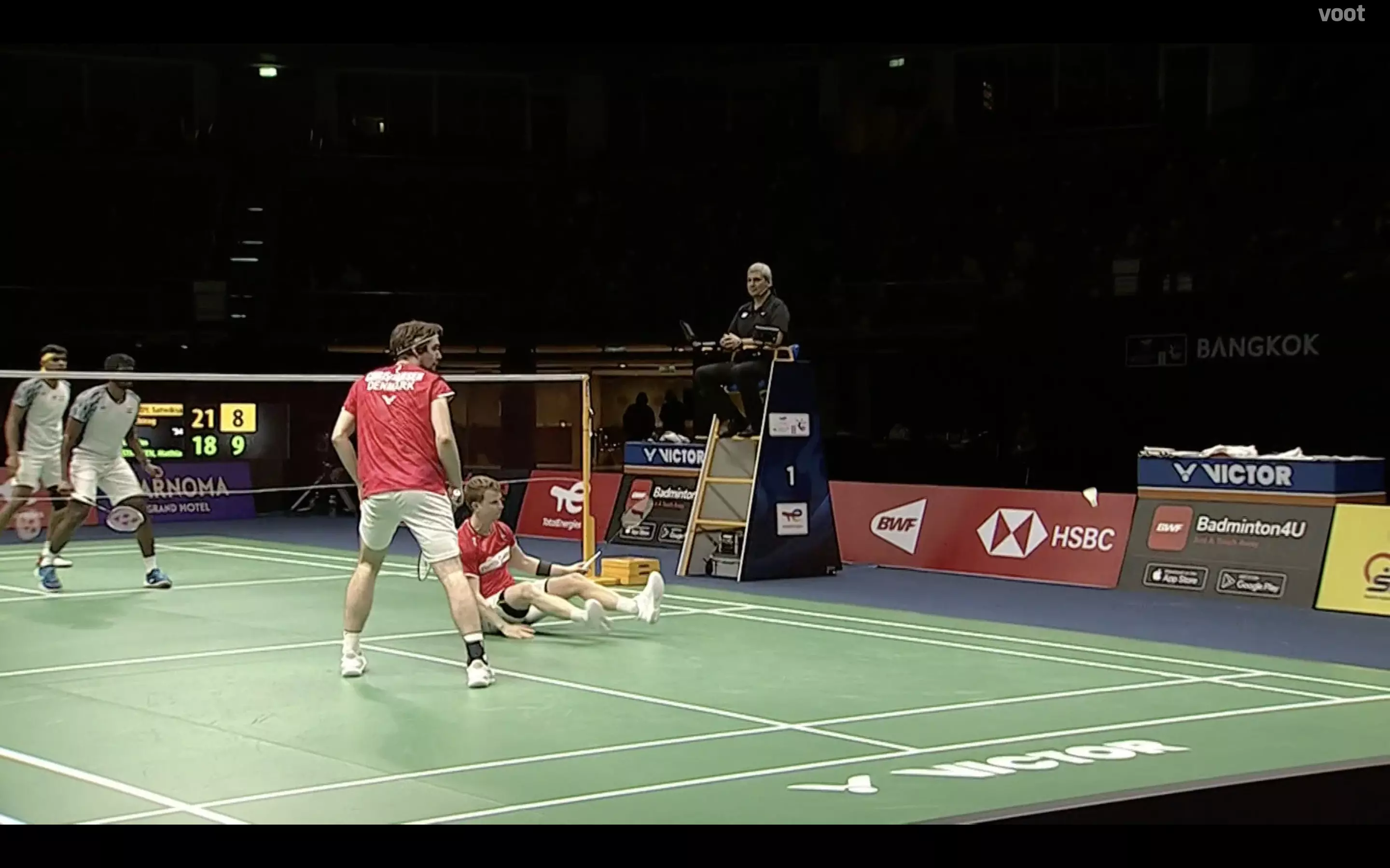 Kim Astrup looks at Satwik's serve as he slips and falls. India levels up at 9 ALL!