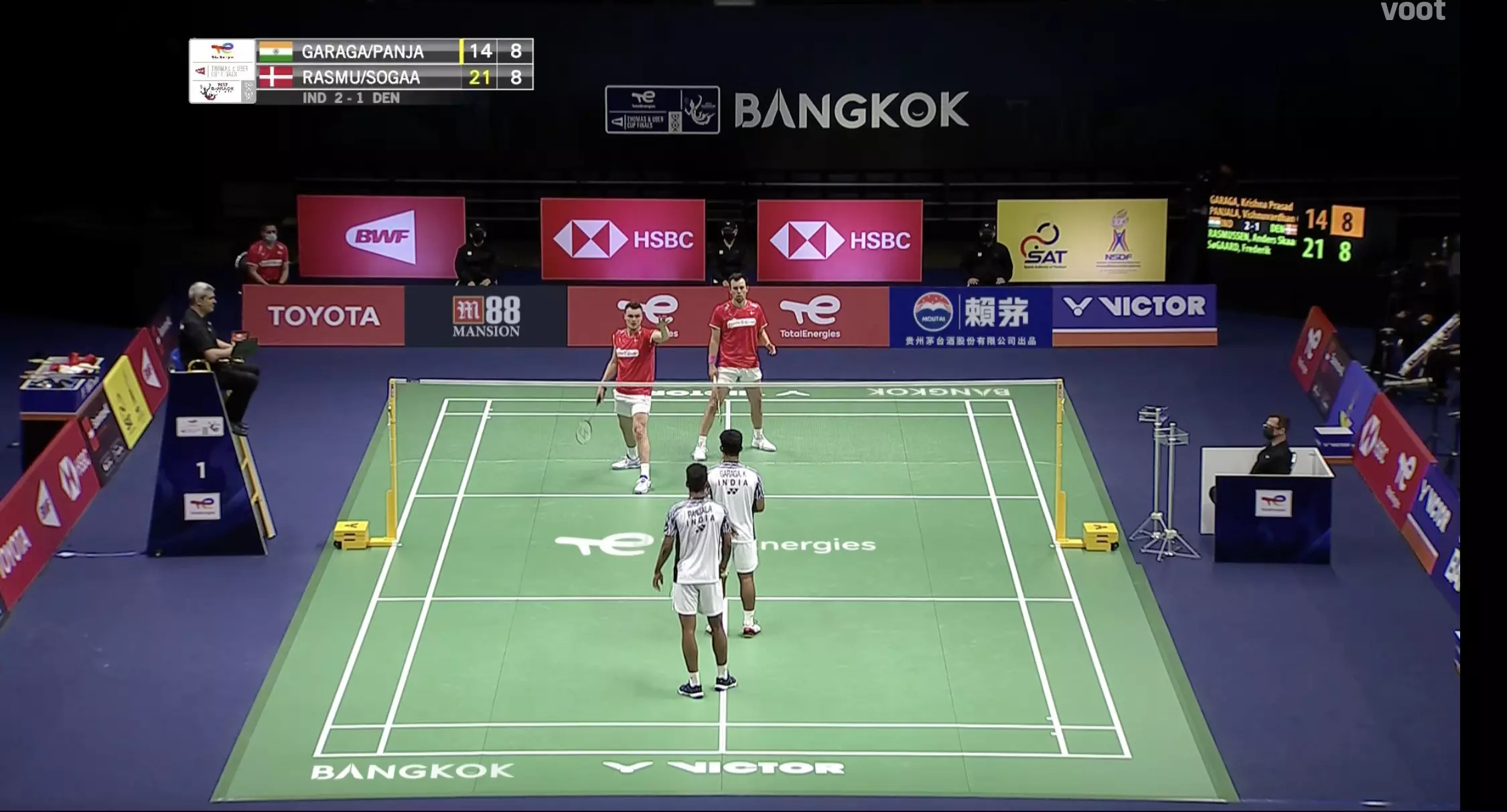 The Indians are slowly losing out, falling short with constant errors. Rasmussen and Sogaard lead by 15-10.