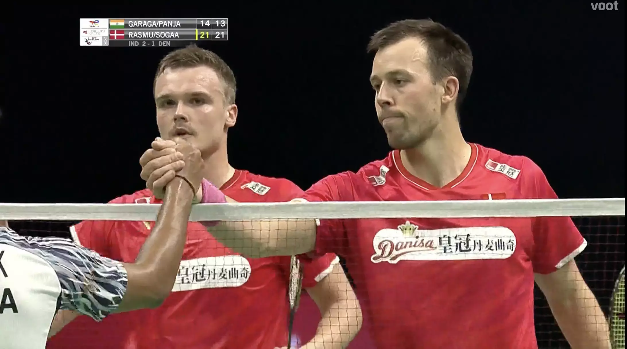 Frederik Søgaard and Anders Skaarup Rasmussen beat P. Garaga and Vishnu Panjala in the men's doubles clash by 21-14, 21-13.