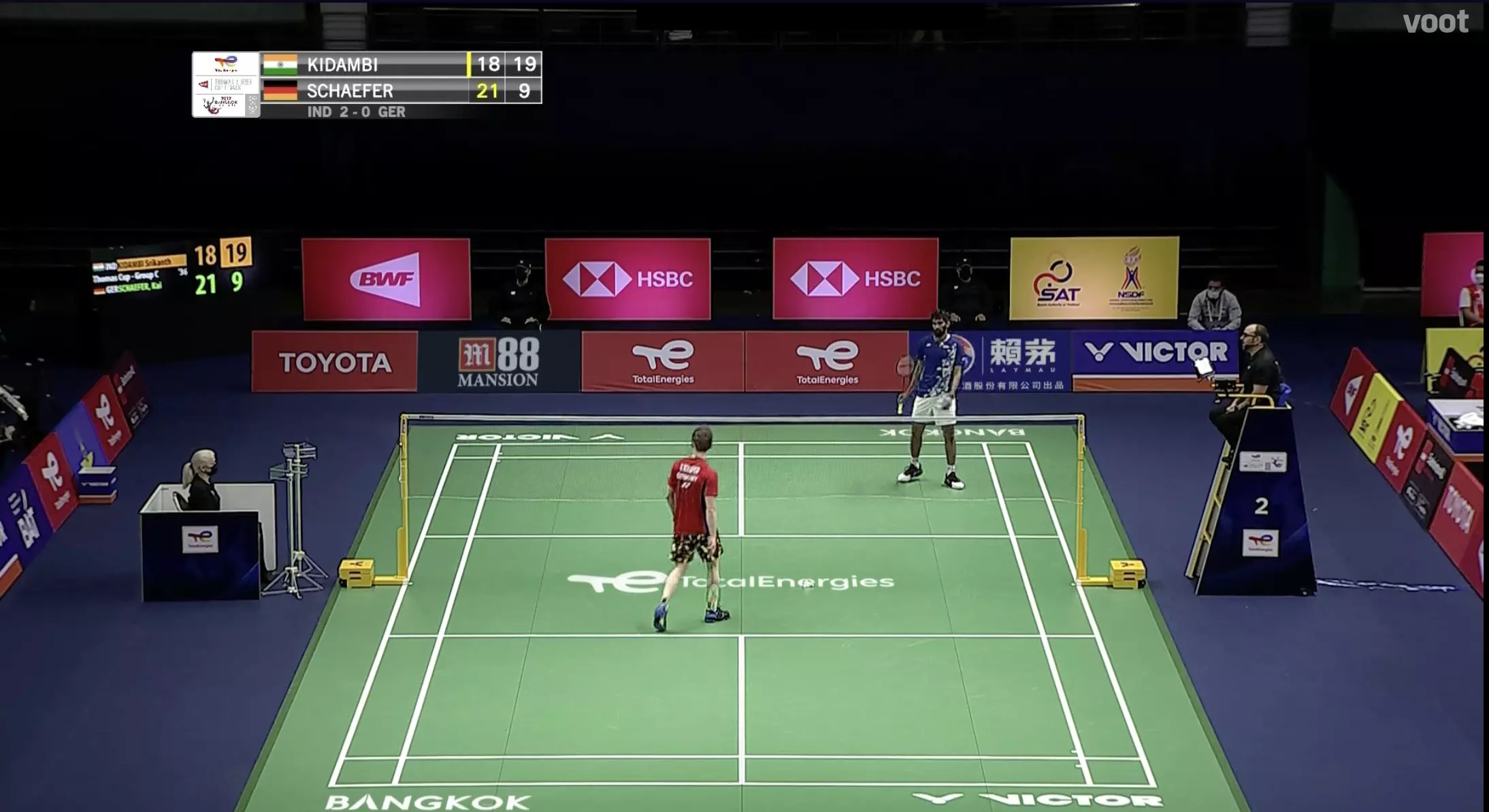 Brilliant cross-court play by Schaefer, he gets the better off Kidambi with a body smash and earns a point. He leads 2-1