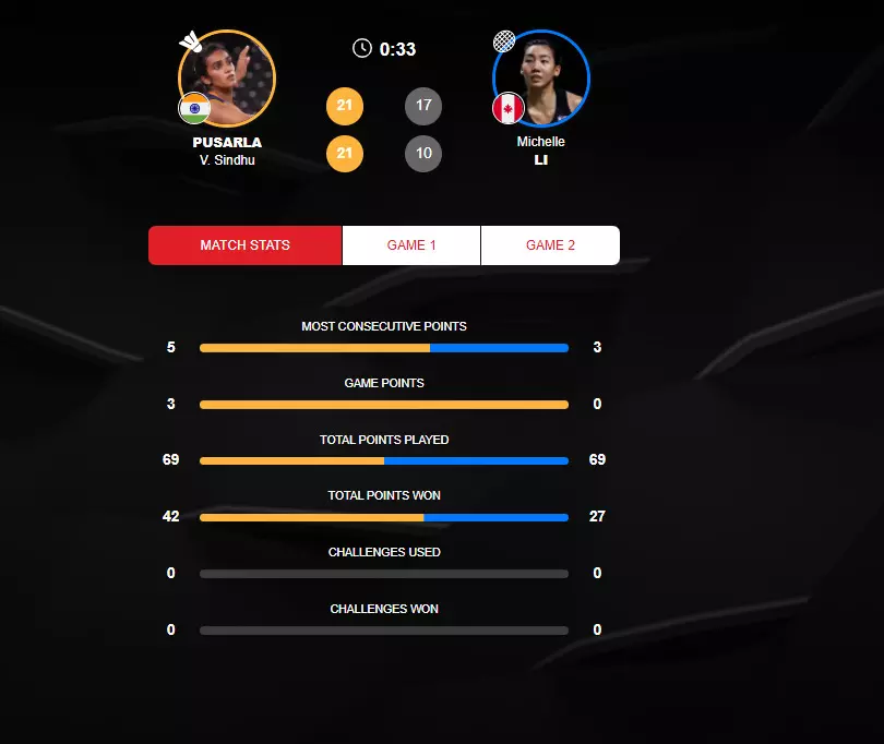 Easy peasy for PV Sindhu as he pockets the first match of the tie 21-17, 21-10. Expected result, but 33 minutes is all it took for the double-Olympic medallist to wrap this up.