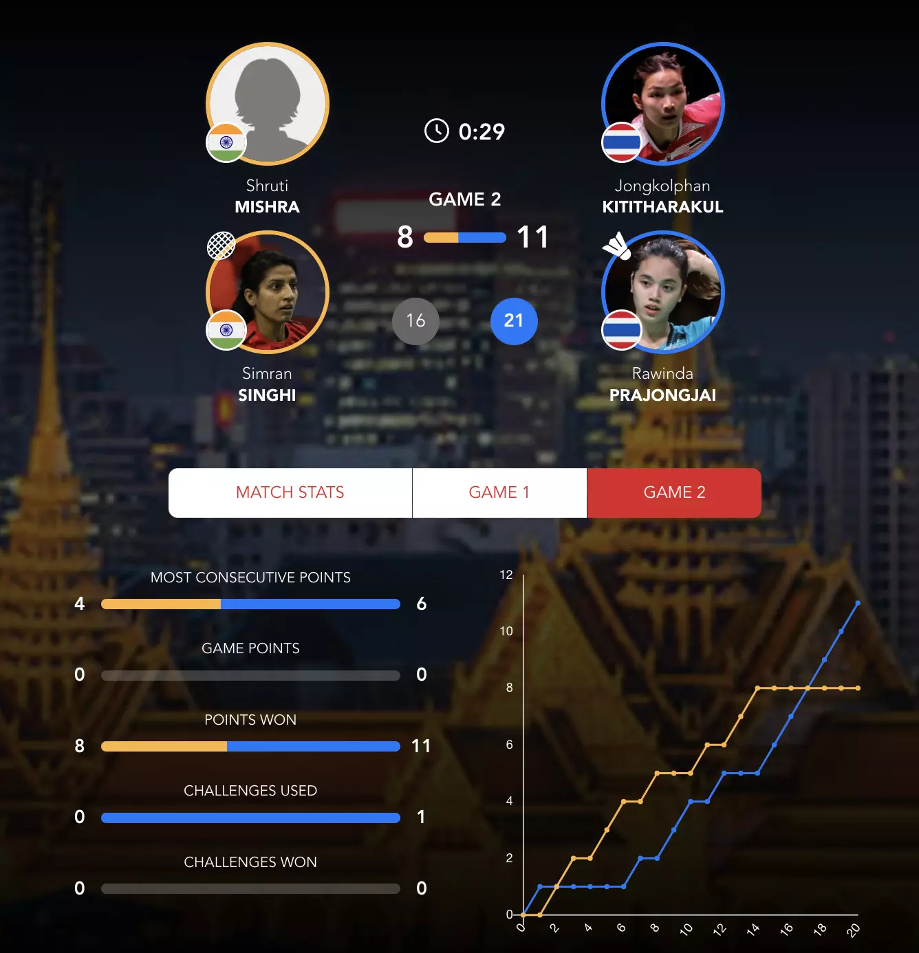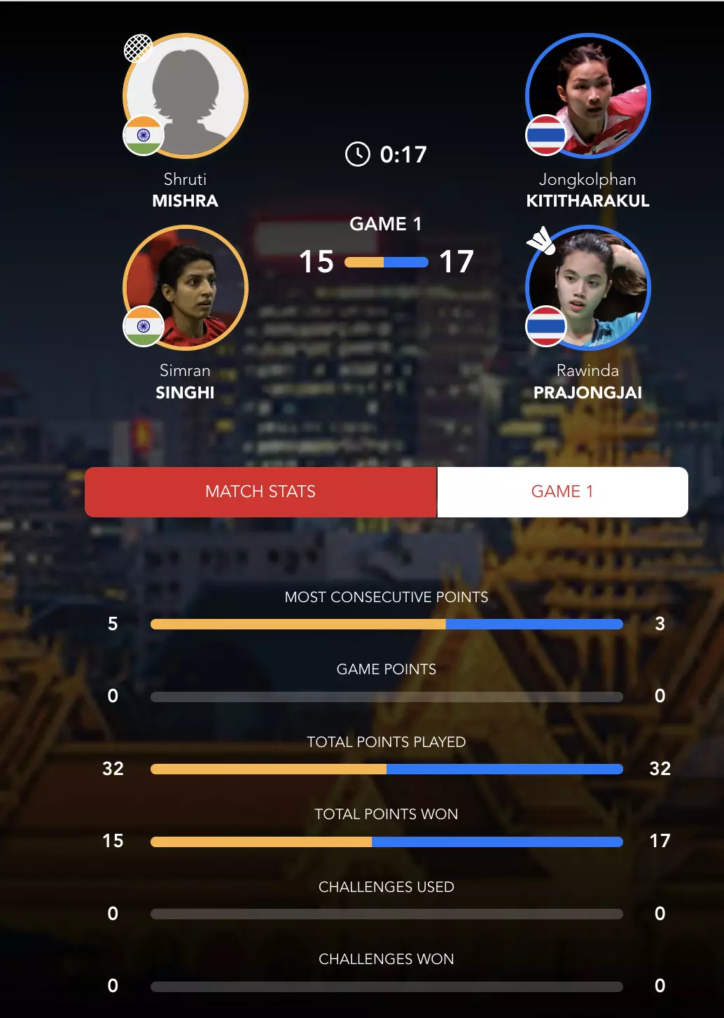 Too many errors from Simran and Shruti again as nerves probably get to them. The Thai duo lead 11-8