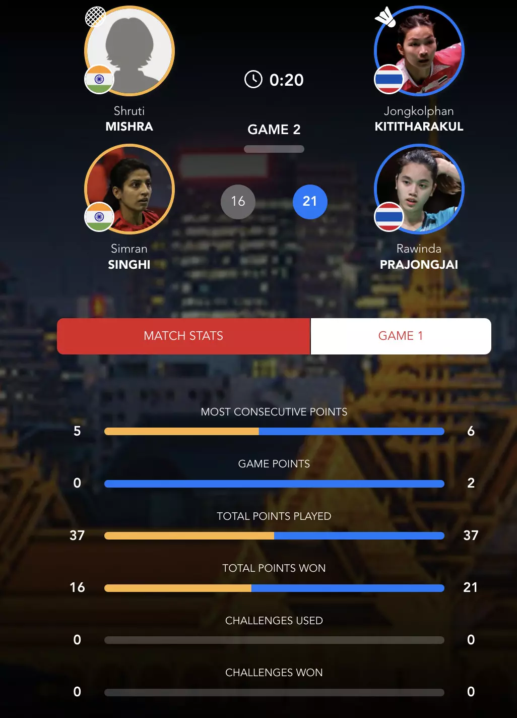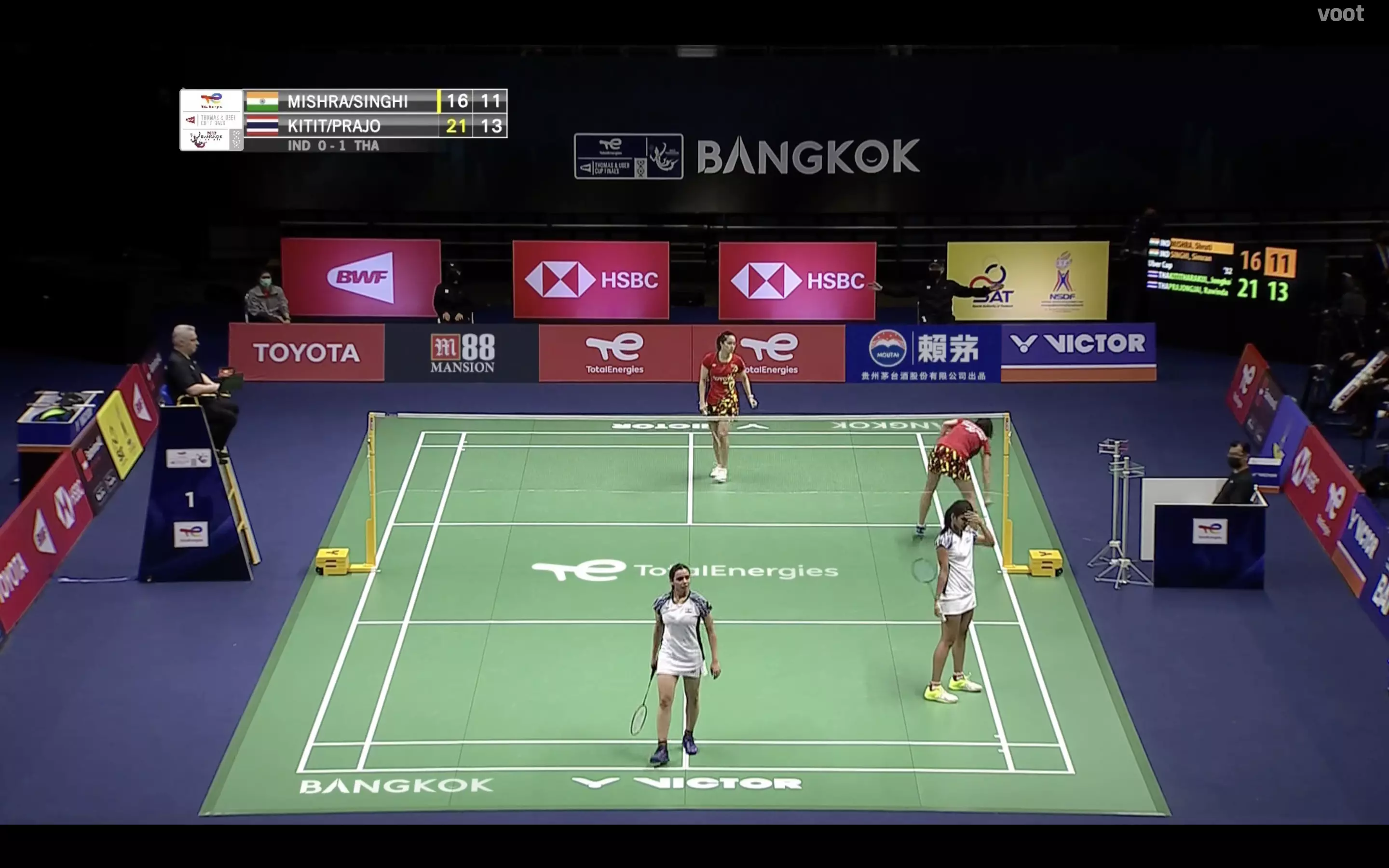 Simran and Shruti give it their all but the Thai pair gain momentum at the right juncture to take the first game, 21-16