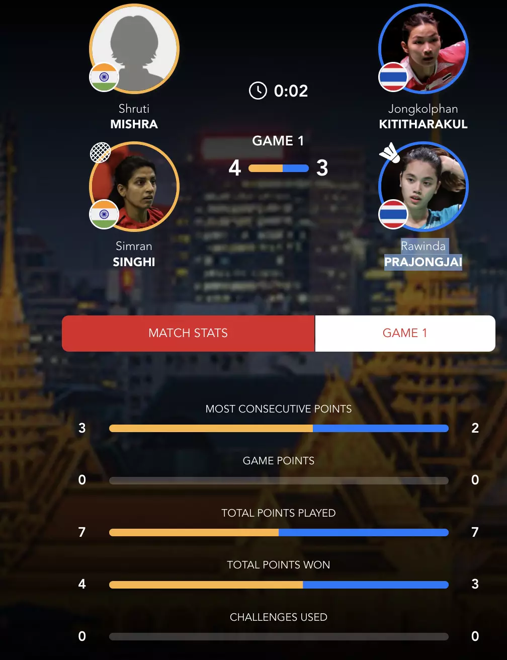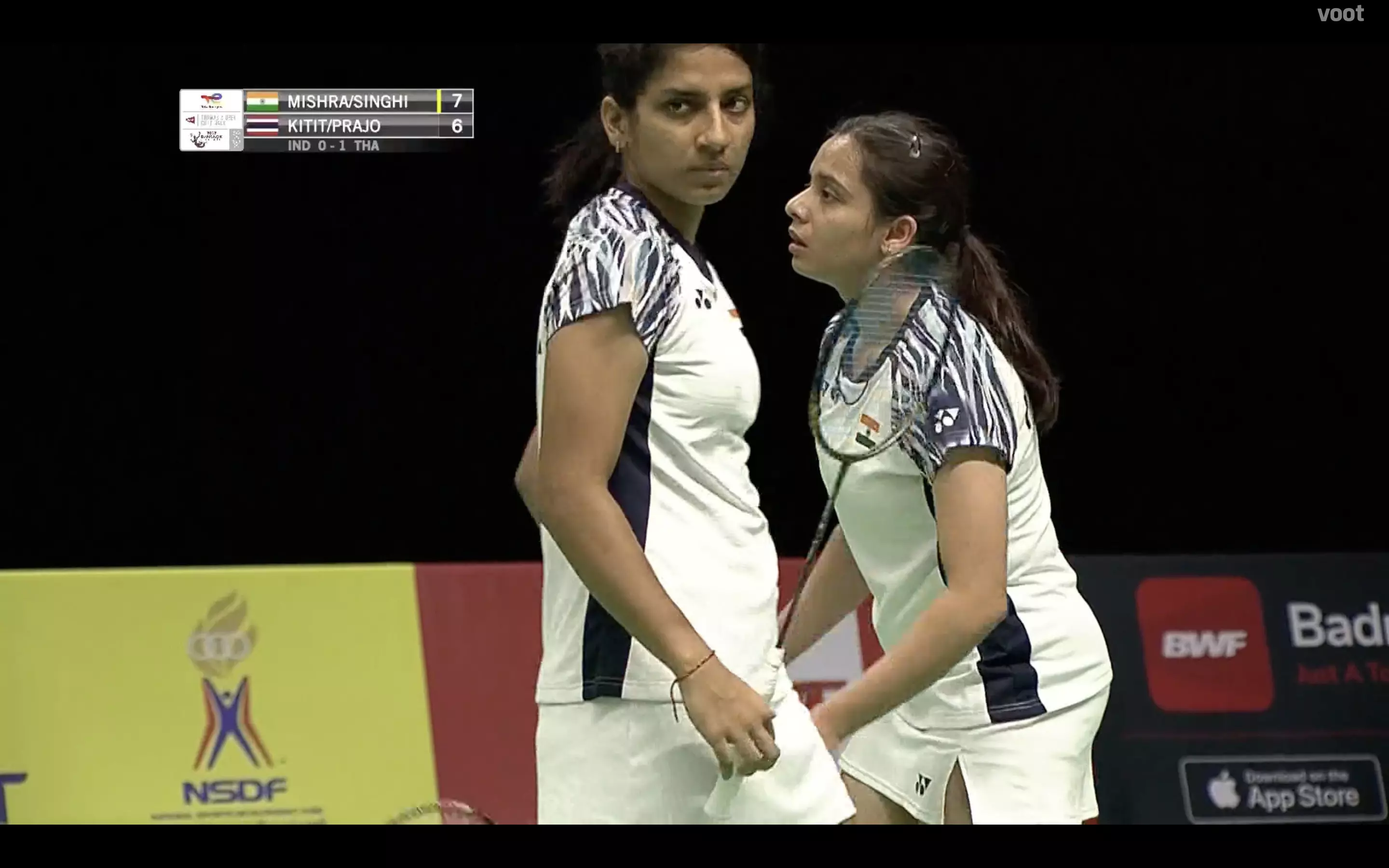 Next up we have Simran Singhi and Shruti Mishra taking on the World No.8 Thai duo of Jongkolphan Kititharakul and Rawinda Pranjongjai.