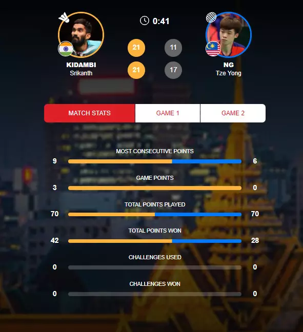 Kidambi Srikanth has done it. He has beaten NG Tze Yong 21-11, 21-17 in 41 minutes. But, more importantly, he has given India a 2-1 lead in this all-important Quarterfinal tie against Malaysia.