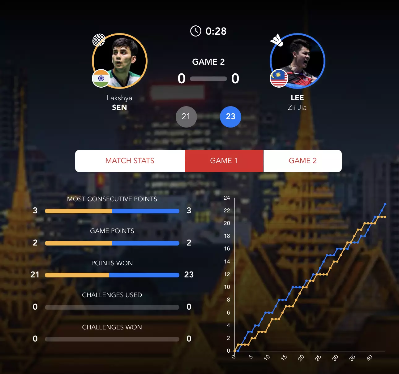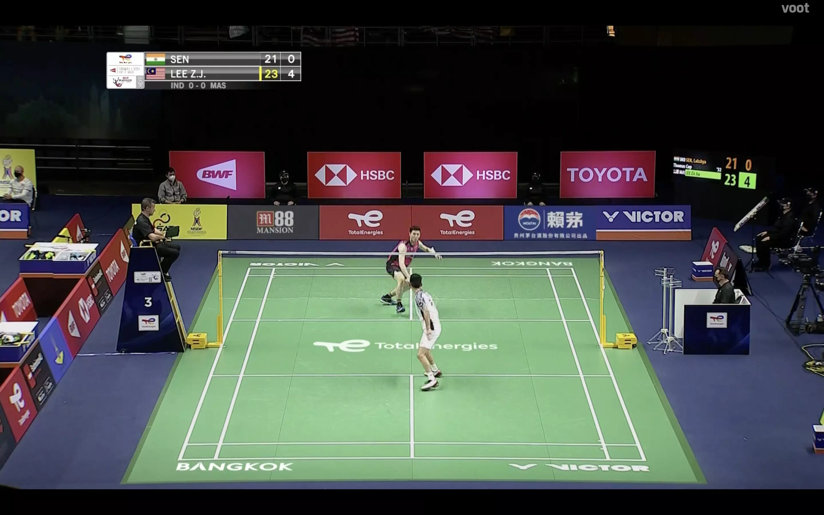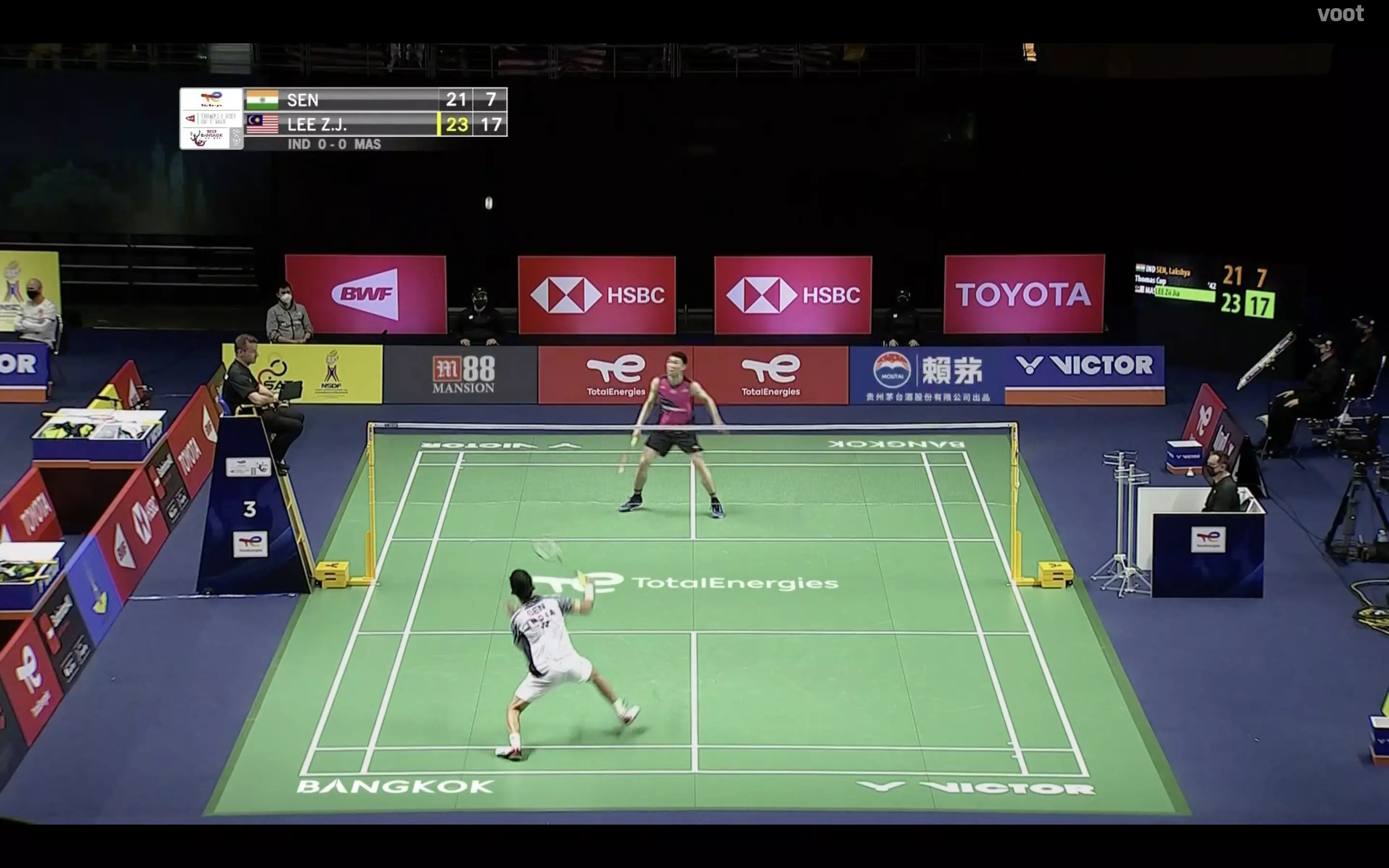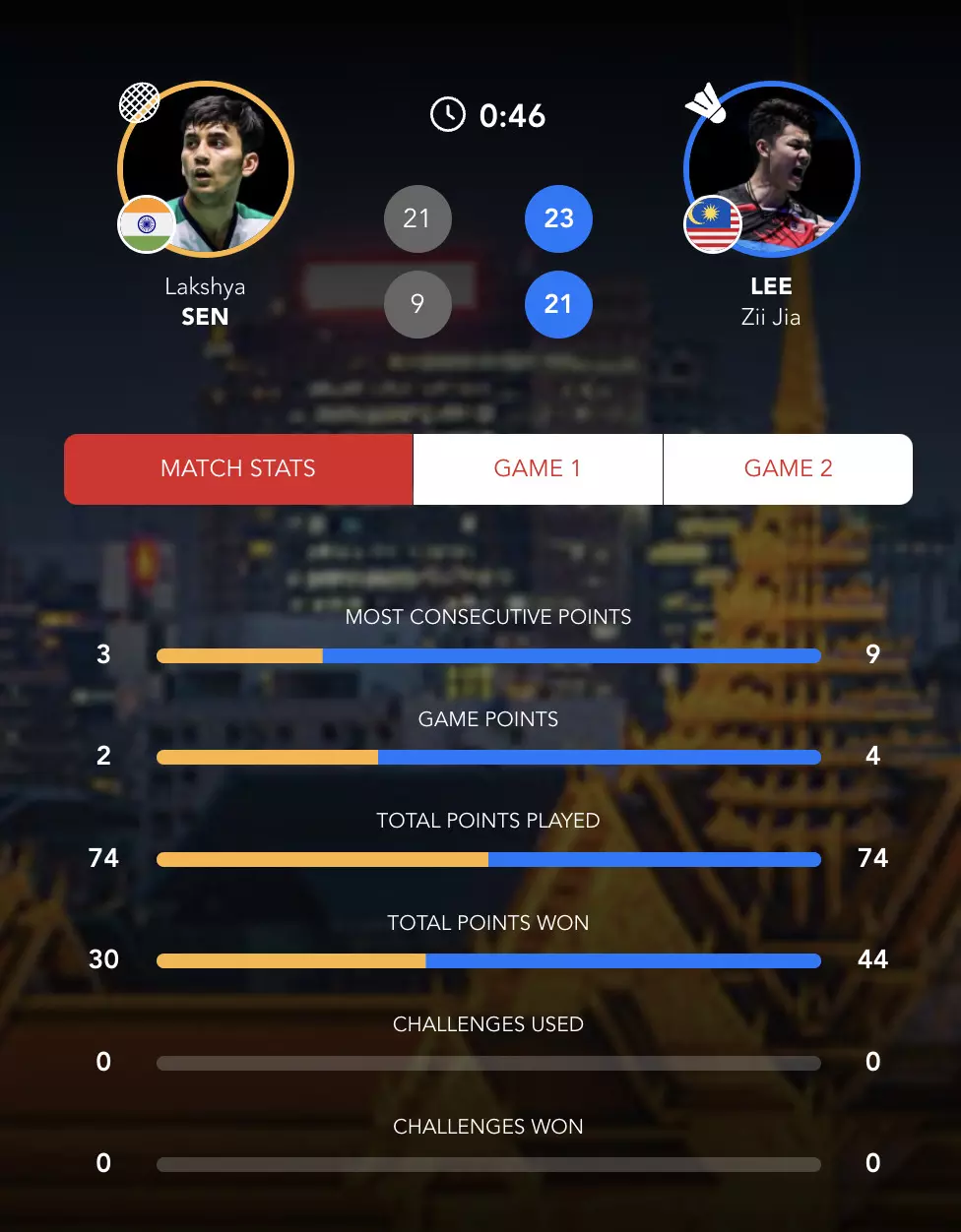 Lee Zii Jia gets the momentum and wins the first game 23-21 by such a narrow margin. Lakshya Sen couldn't capitalise his game points.