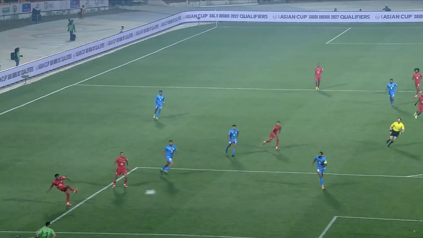 Bangladesh start with the possession and the ball is already inside the penalty box. Vishal Kaith comes in to clear it at the baseline on the left and just ends up kicking the ball to a Bangladesh forward.