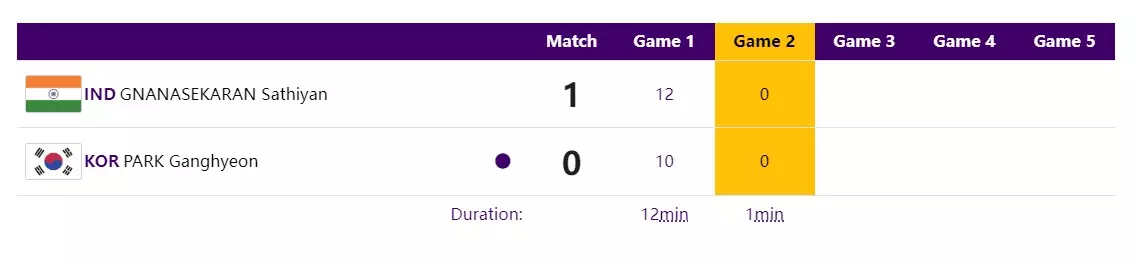 Sathiyan wins two straight points to win the first game against Park. Sathiyan now leads 1-0 in the second match of the tie between India and South Korea.