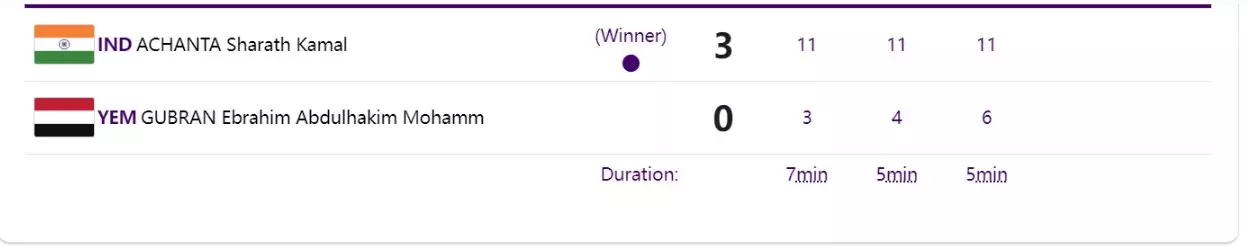 Sharath wins the second match of the tie against Yemen and gives India a 2-0 lead. Sharath needs just 17 minutes to wrap up the match 11-3, 11-4, 11-6.