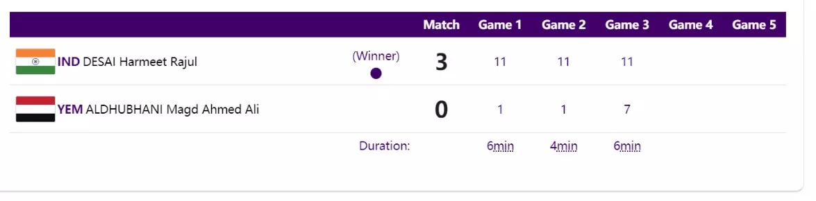 Harmeet Desai wins the third match 11-1, 11-1, 11-7 in 16 minutes against Ahmed Ali Aldhubani and seals the group stage tie for India against Yemen 3-0. A great start for the Indian men's team, the 2018 Asian Games bronze medallist.