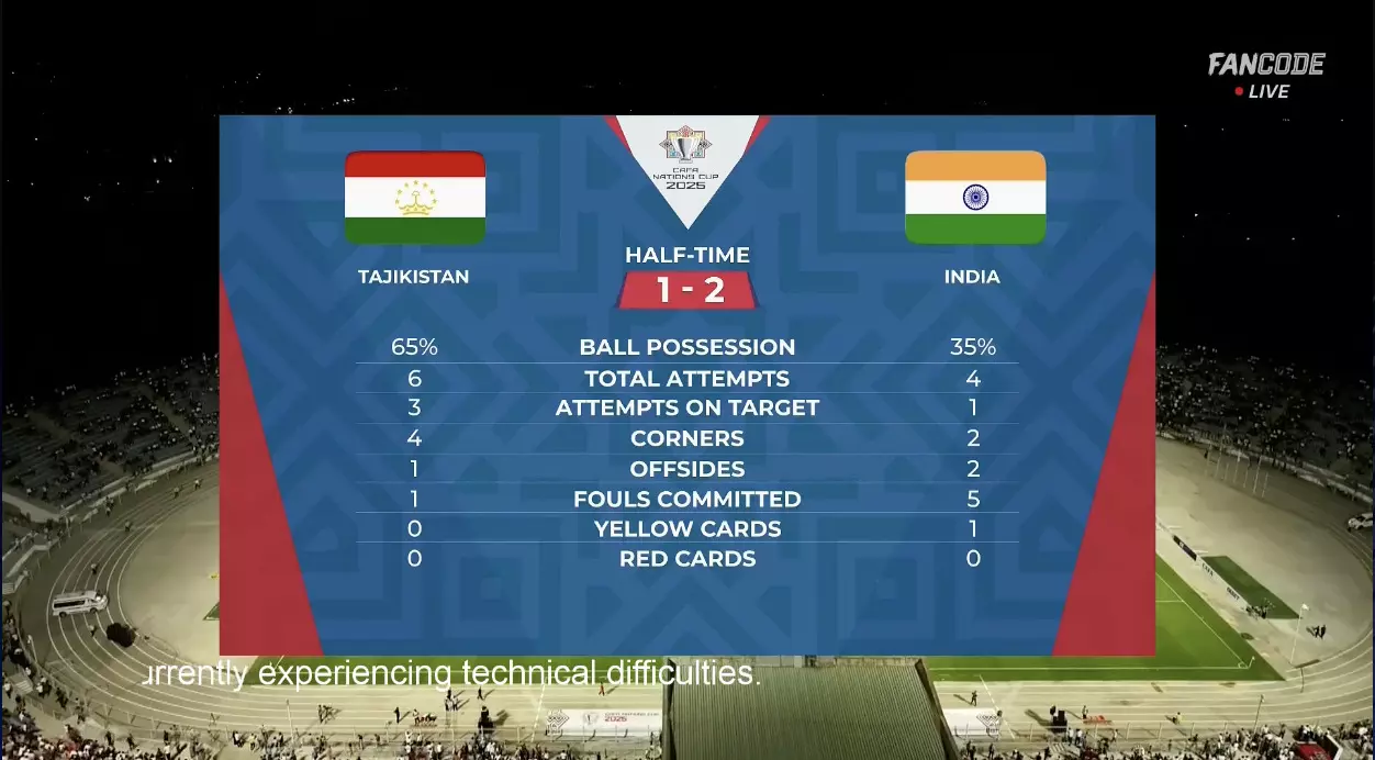 The first half ends with India 2–1 Tajikistan. India started brightly, scoring twice in the opening 12 minutes, but Tajikistan fought back well and have been the more threatening side in the latter stages. The Blue Tigers will need to tighten up defensively and maintain focus as the second half approaches.