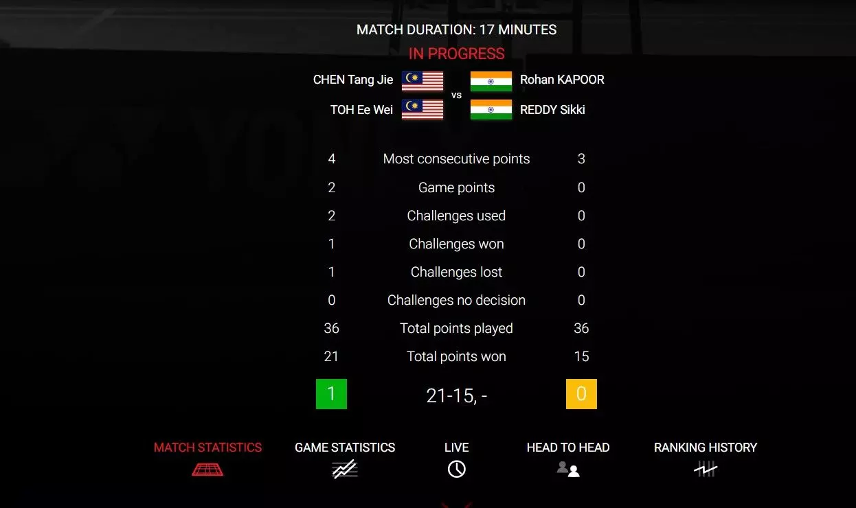 Chen Tang Jie-Toh Ee Wei does not have much difficulty in claiming the first game lead at 21-15 against India's N Sikki Reddy and Rohan Kapoor.
