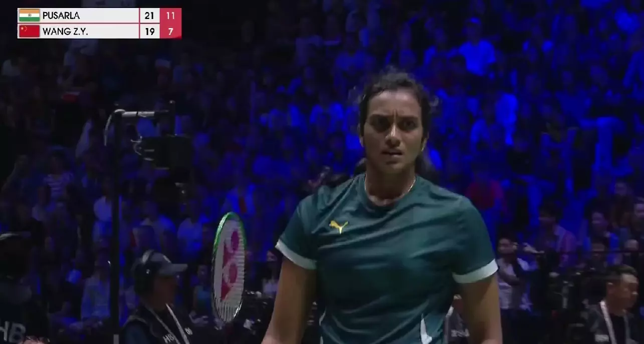 A brilliant cross-court smash from Sindhu rattles a diving Wang for a point