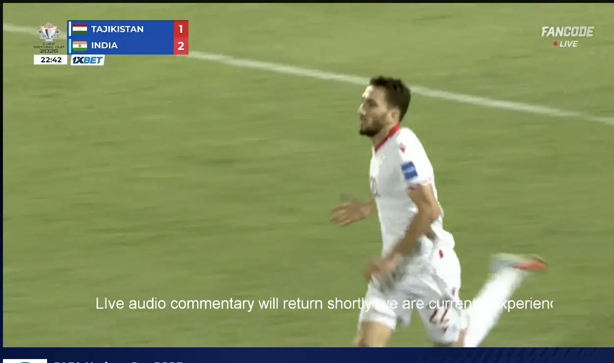 A sharp move from the hosts — Akhtam Nazarov threads a neat pass, and Ehsoni Panshanbe shows great playmaking vision to find Shahrom Samiev inside the box. He finishes clinically, and the crowd erupts in Hisor!India 2–1 Tajikistan