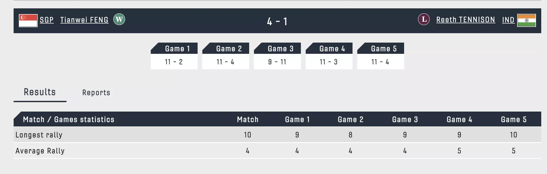Well-fought from Reeth as she even takes off a game from WR 16 Feng but she loses the clash, 4-1
