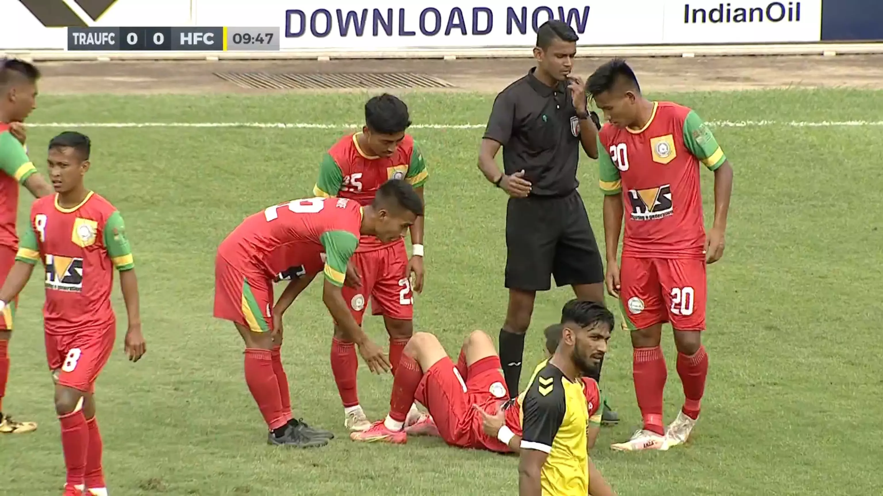 TRAU skipper Komron is down as the HFC goalkeeper rushed outside his box to tackle him gifting the free kick to TRAU,
