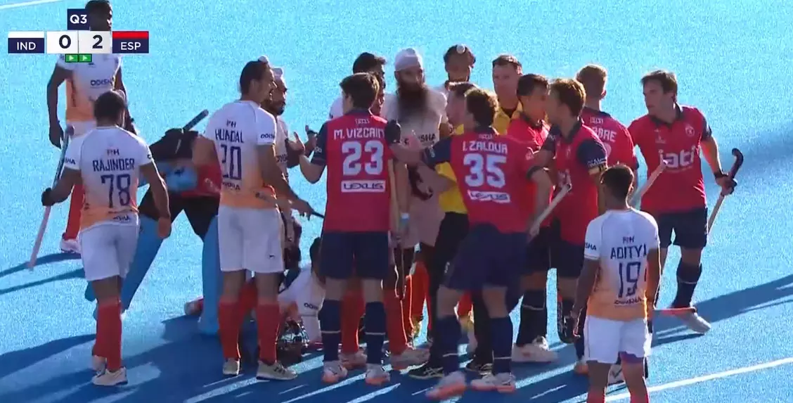 The pressure continues as Spain earn two more back-to-back penalty corners. Amid the chaos, Vivek is injured, leading to a heated exchange between the players before tempers finally settle.
