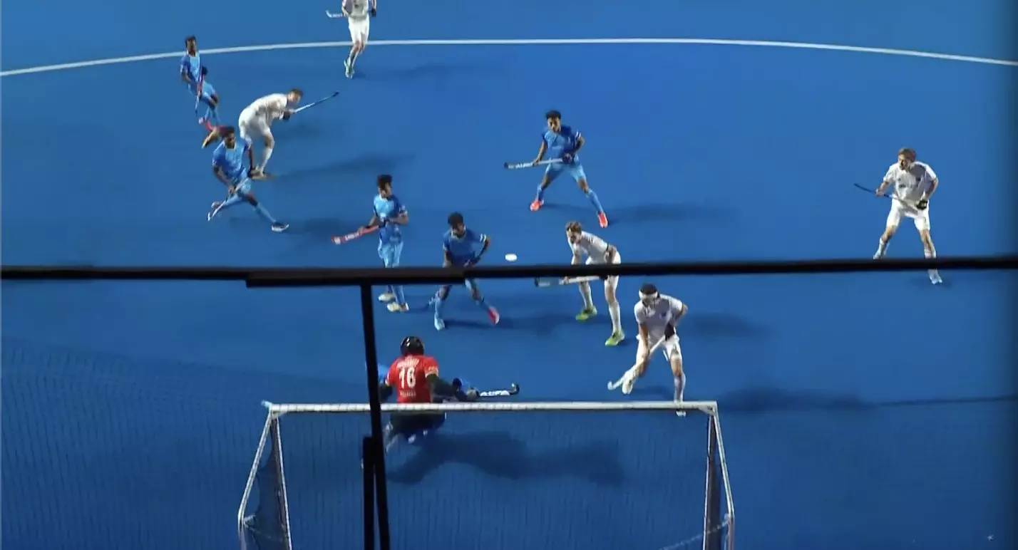 Germany break through the right channel and fire a sharp shot on goal, forcing a strong stop from the Indian goalkeeper. Great positioning and reflexes keep the scores level as Germany threaten early.India 0-0 Germany