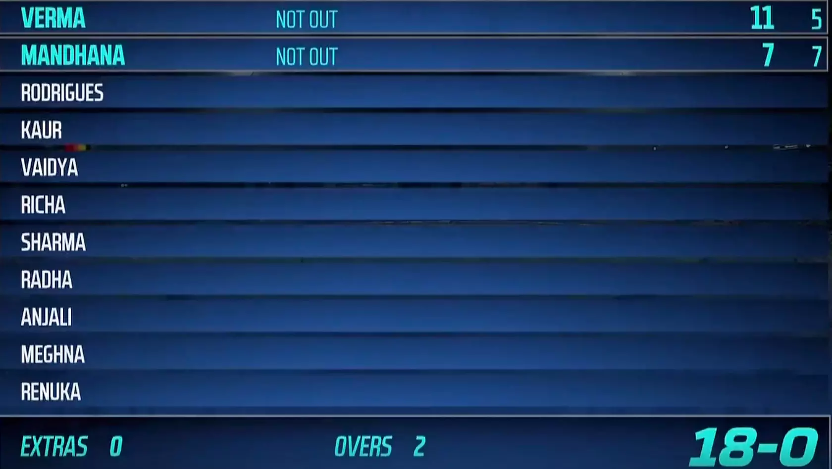 Smriti tries to break loose at the other end. Flat bats a cut to get a boundary. Lofts the ball towards long on to end the 2nd over, but it is cut off at the ropes.