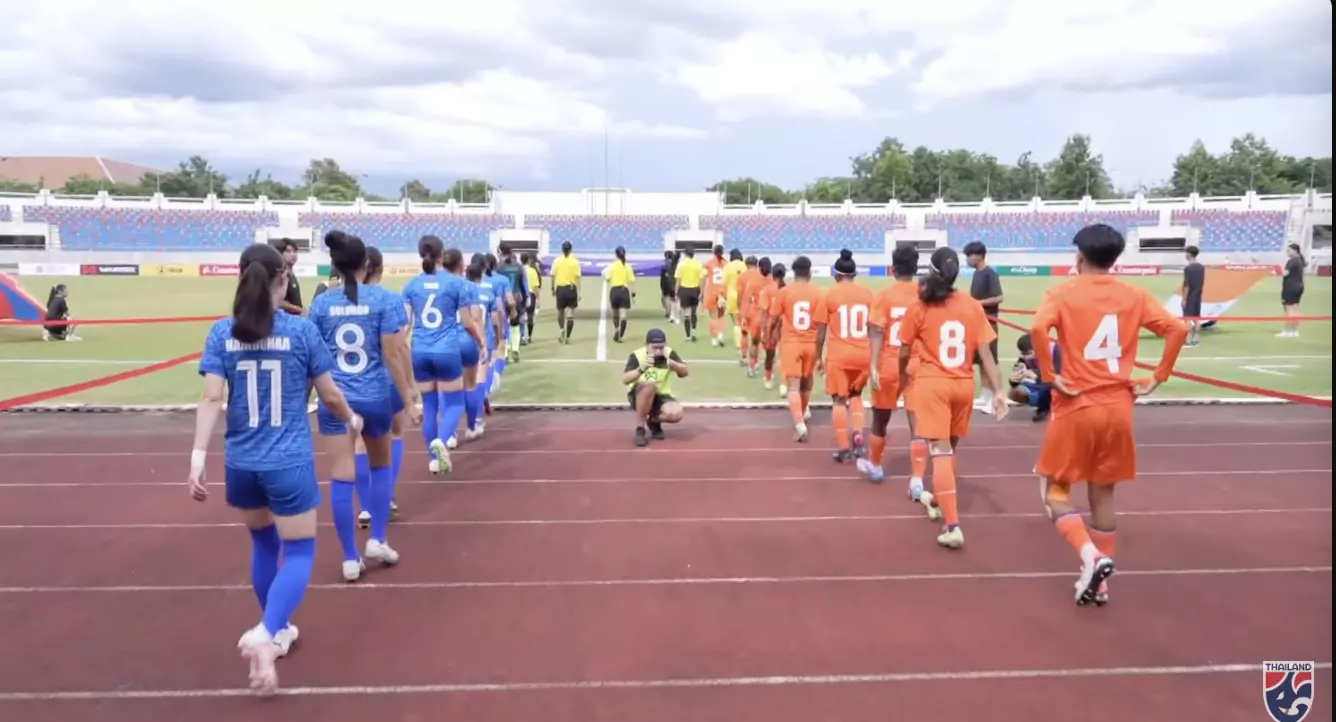 It’s about time — the two teams are walking out onto the pitch at the 700th Anniversary Stadium, led by their captains, Sweety Devi Nganbam for India and Tsasan-Okhin Orogdol for Mongolia