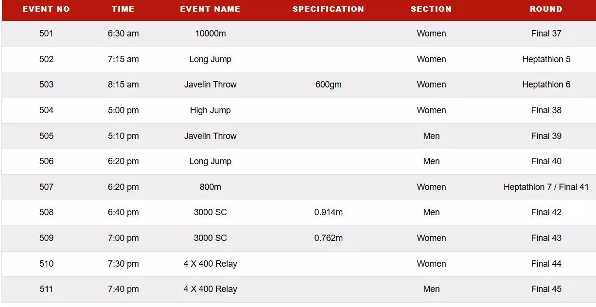 Also, the men's and women's 4*400m relay finals will be the final two events of the championships - no better finish can be given to an exciting five-day-long track and field program.
