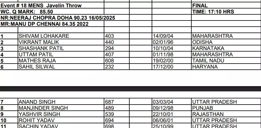 The men's javelin throw field is packed with top athletes like Sachin Yadav, Rohit Yadav, Yashvir Singh, and Shivam Lohakare.