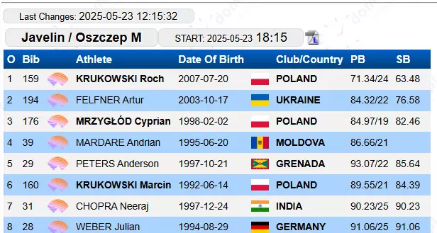 Here is the start list of the 8-man javelin throw final: