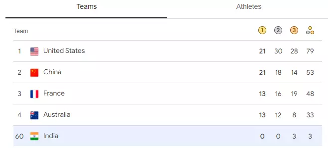 Currently, India is standing in the 60th Position, while the Americans top the table with 21 golds and a total of 79 medals after the first ten days of the Olympics.