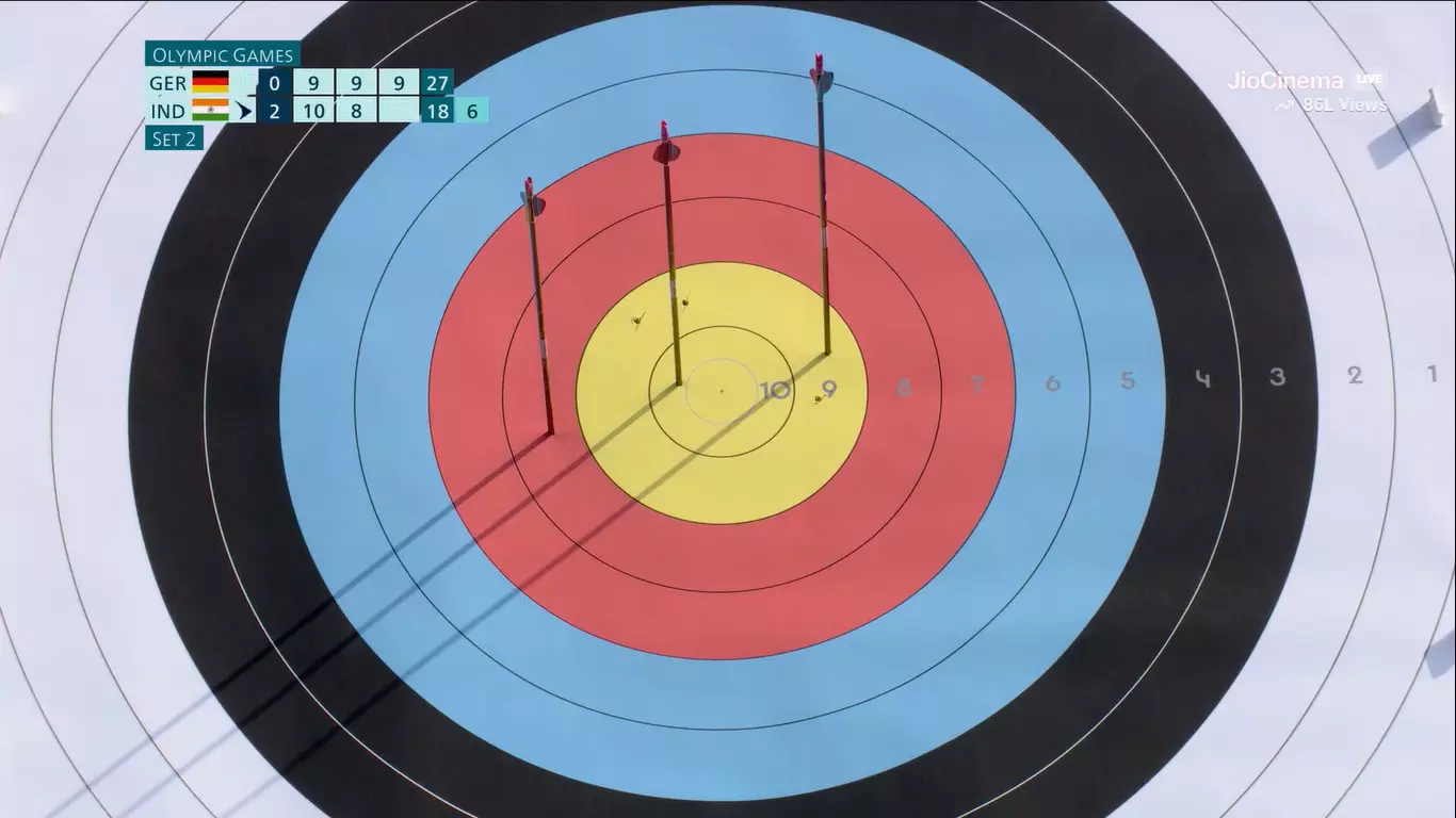 Deepika leads the match 3 points to 1, her last arrow hit 9 to make the score an even steven.