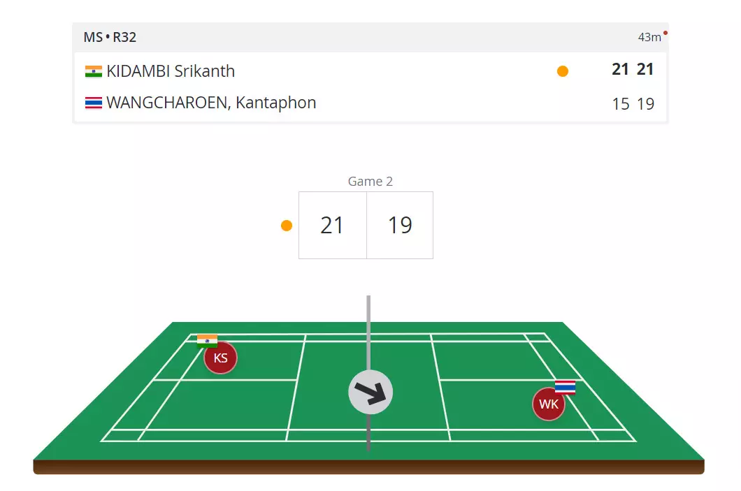 Kantaphon showed some resistance in the second game but Kidambi Srikanth overcomes it and wins the match 21-15, 21-19.