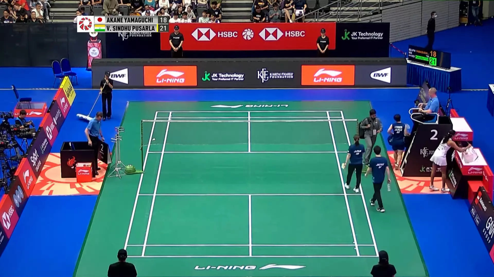 Sindhu wins the first game 21-18.