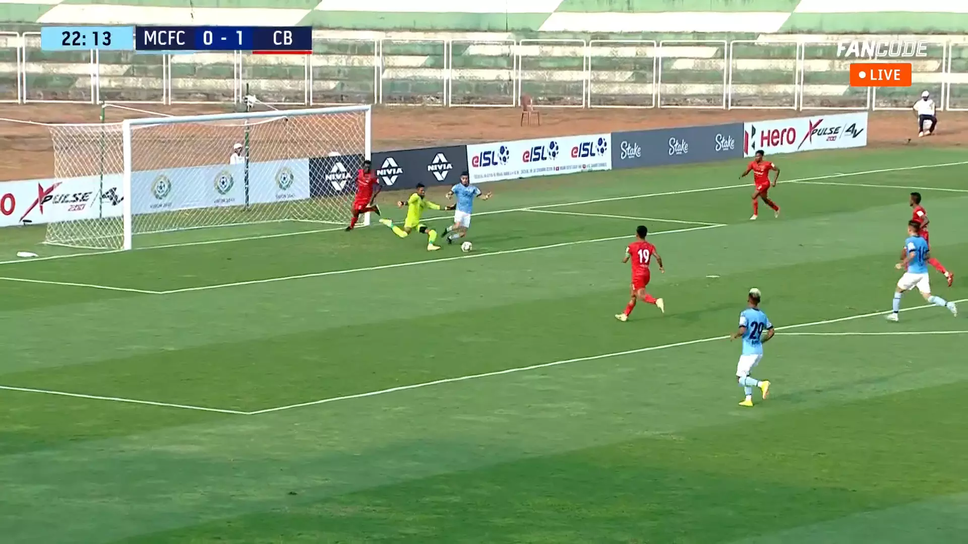 Good move from Mumbai as Chhangte plays the ball across to Vikram, who just couldn't get it under control as goalie Nora slides and clear the ball away.