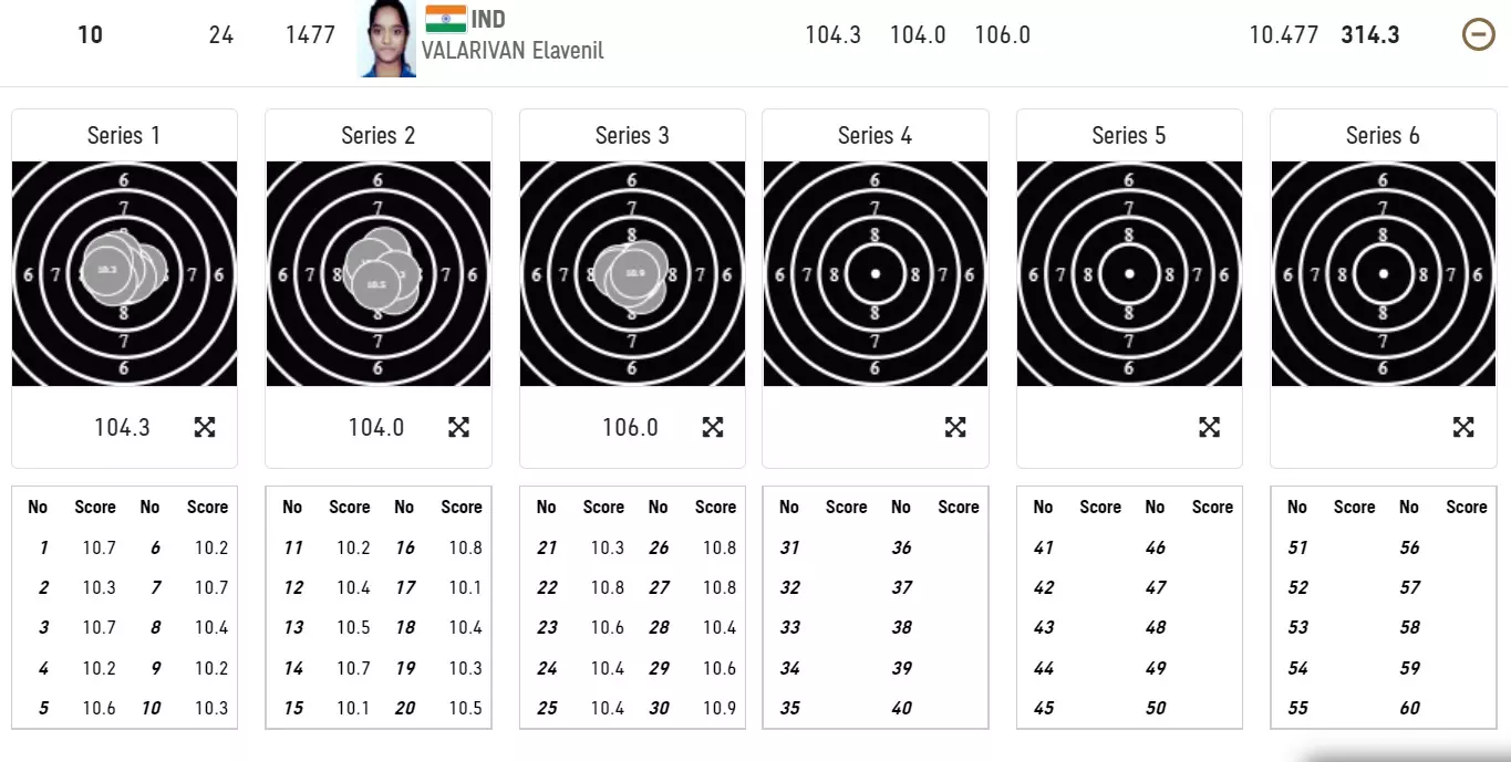 Taking her time seemed to have worked wonders for Elavenil, as she shoots a fantastic 106.0 in her third series. This has helped her climb up to the tenth spot with score of 314.3.