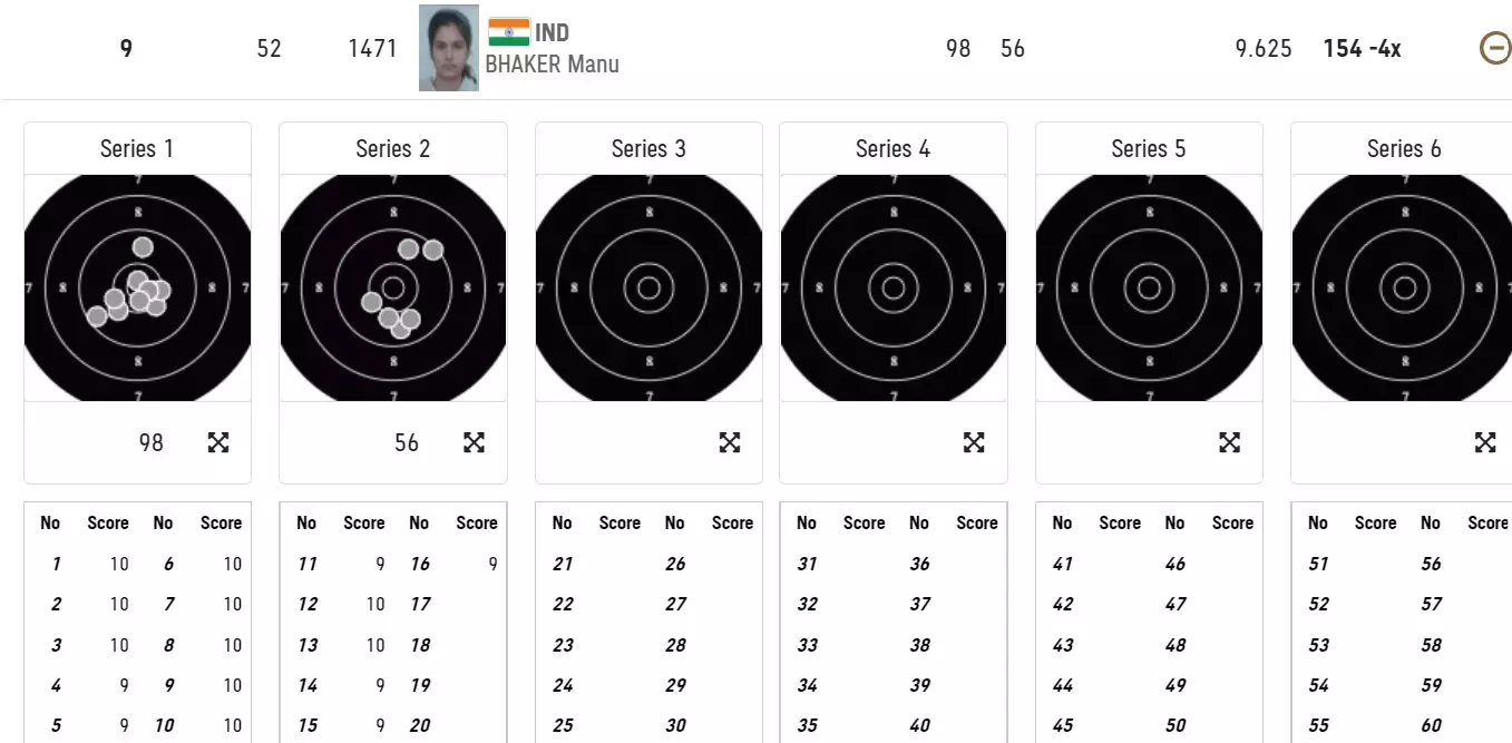 Manu Bhaker seems to be faltering a bit in her second series. Four of her six shots have been 9s and she has fallen down in the standings.