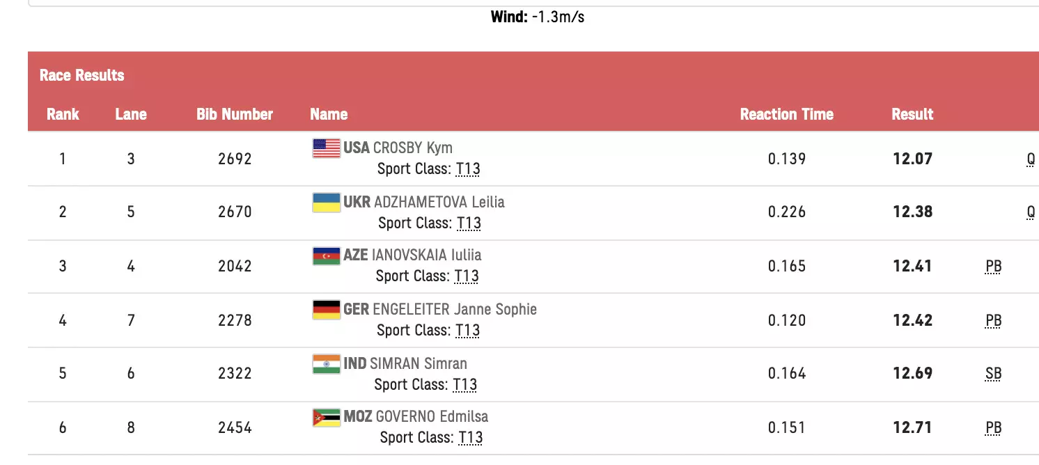 Despite a PB of 12.69, Simran is unable to get the better of the top two competitors who will advance to the next round. She is unfortunately knocked out.
