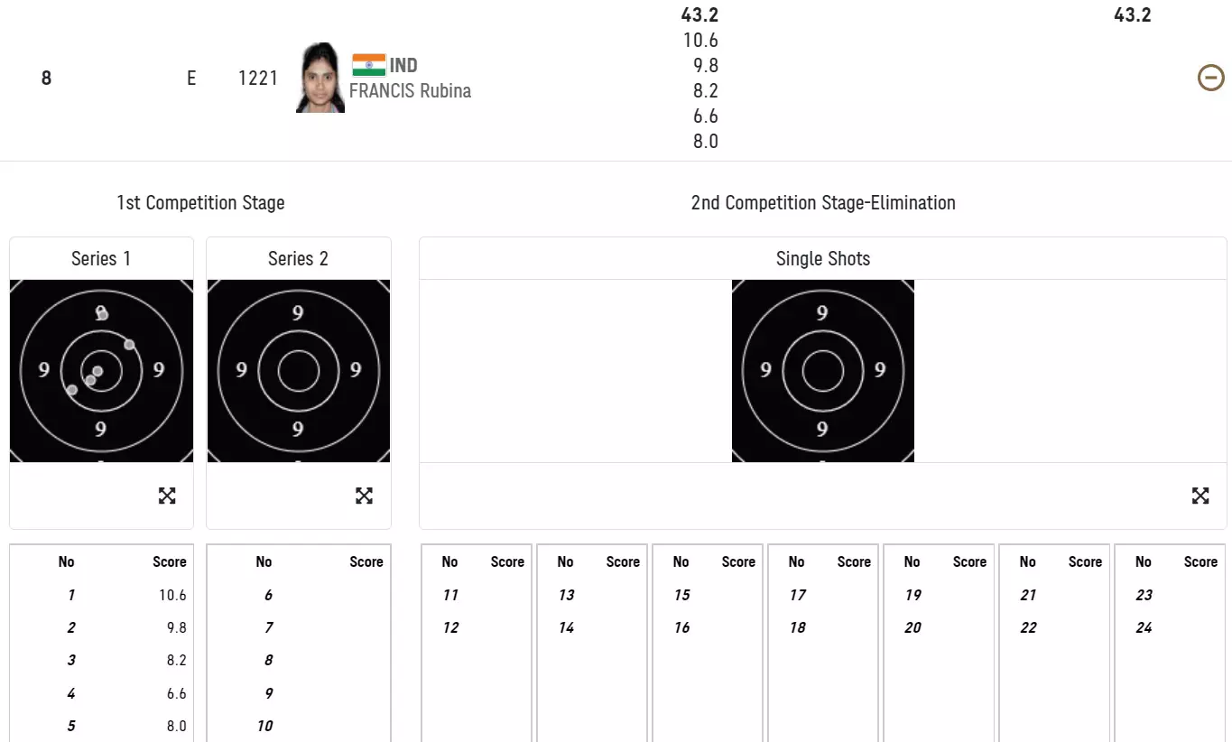 Something seems to be going very wrong for India's Rubina Francis. She is last after the first series of five shots, and stands at the risk of being the first to be eliminated. A lot of 8s and a 6 in her first five shots.