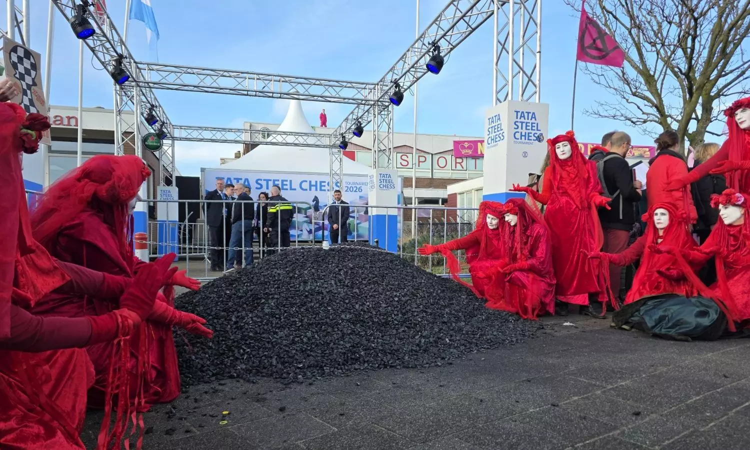 The protestors dumped 2025 kilo of coal at the entrance of 2026 Tata Steel Chess Masters venue