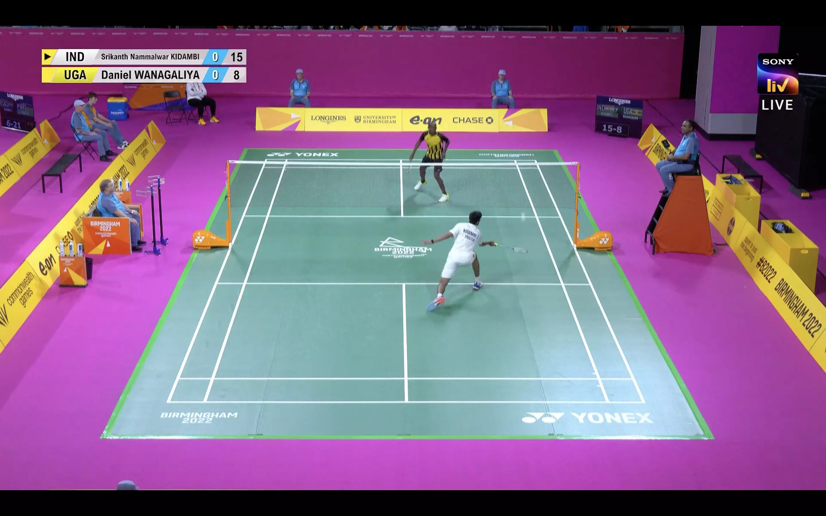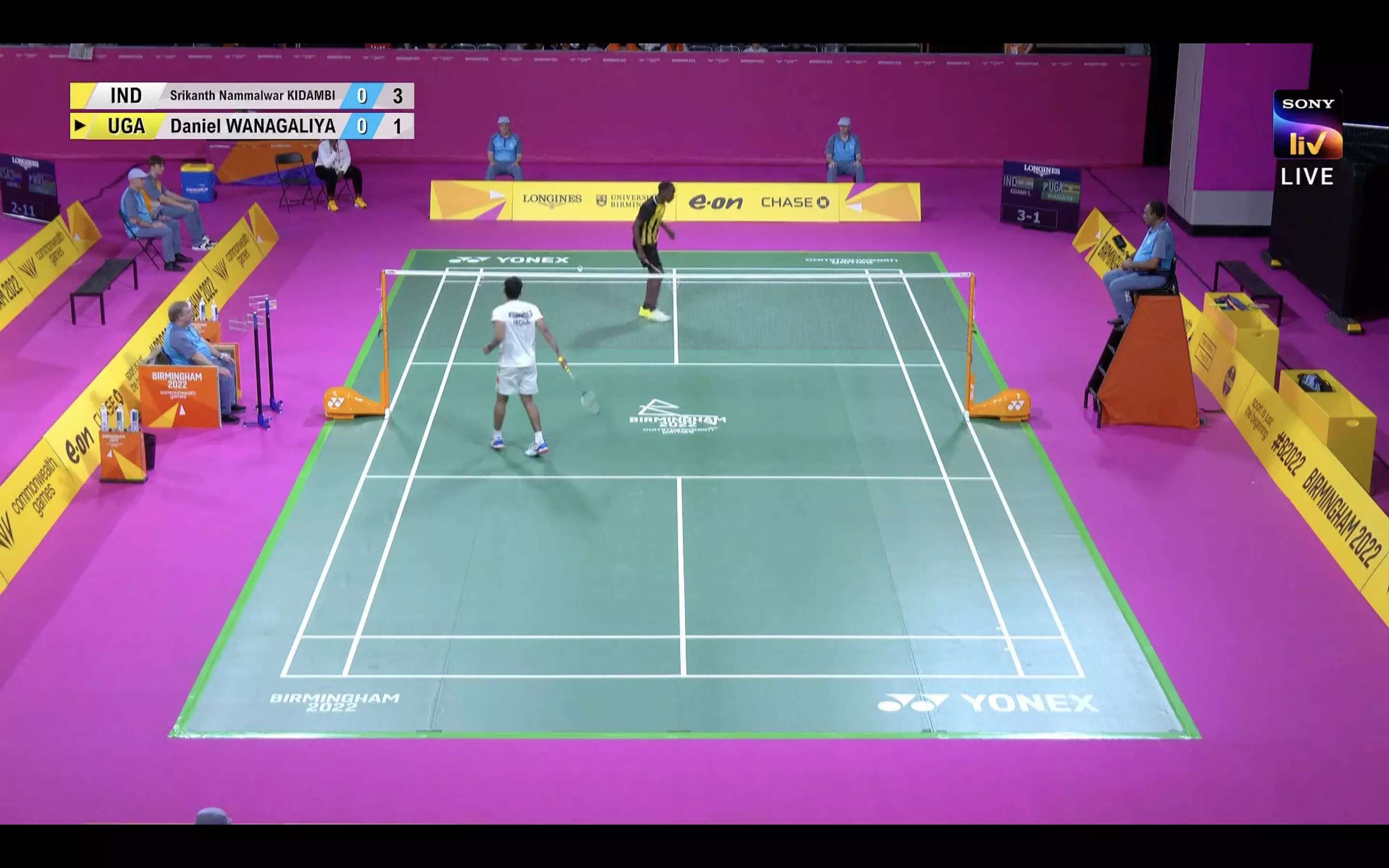 In Game 2, Srikanth leads 11-4 in the mid-game interval but the Ugandan is also good in the rallies