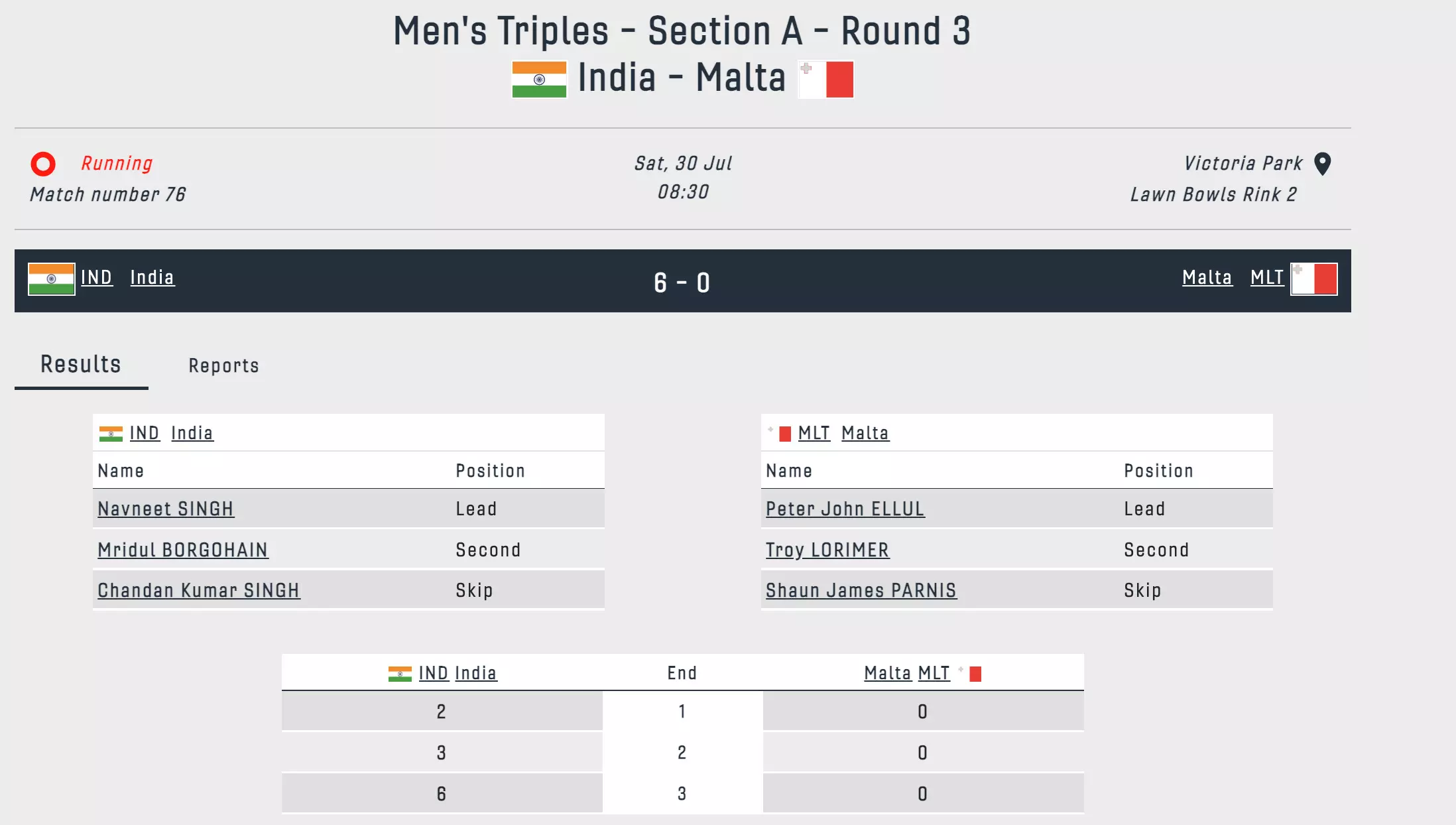 India are beginning Day 2 with a win in Lawn Bowls. They are beating Malta 6-0 at the moment.